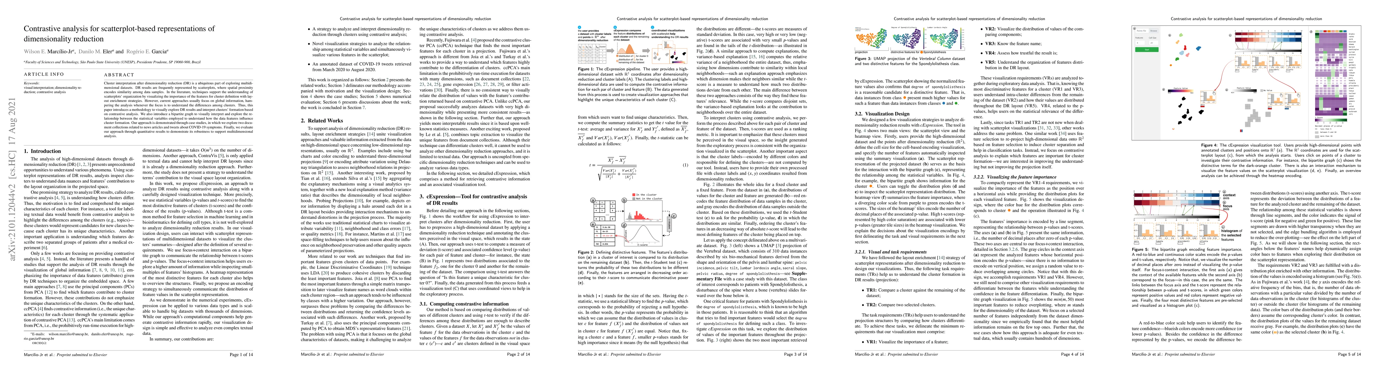 Cluster interpretation after dimensionality reduction (DR) is a ubiquitous part of exploring multidimensional datasets. DR results are frequently represented by scatterplots, where spatial proximity encodes similarity among data samples. In the literature, techniques support the understanding of scatterplots' organization by visualizing the importance of the features for cluster definition with layout enrichment strategies. However, current approaches usually focus on global information, hampering the analysis whenever the focus is to understand the differences among clusters. Thus, this paper introduces a methodology to visually explore DR results and interpret clusters' formation based on contrastive analysis. We also introduce a bipartite graph to visually interpret and explore the relationship between the statistical variables employed to understand how the data features influence cluster formation. Our approach is demonstrated through case studies, in which we explore two document collections related to news articles and tweets about COVID-19 symptoms. Finally, we evaluate our approach through quantitative results to demonstrate its robustness to support multidimensional analysis.