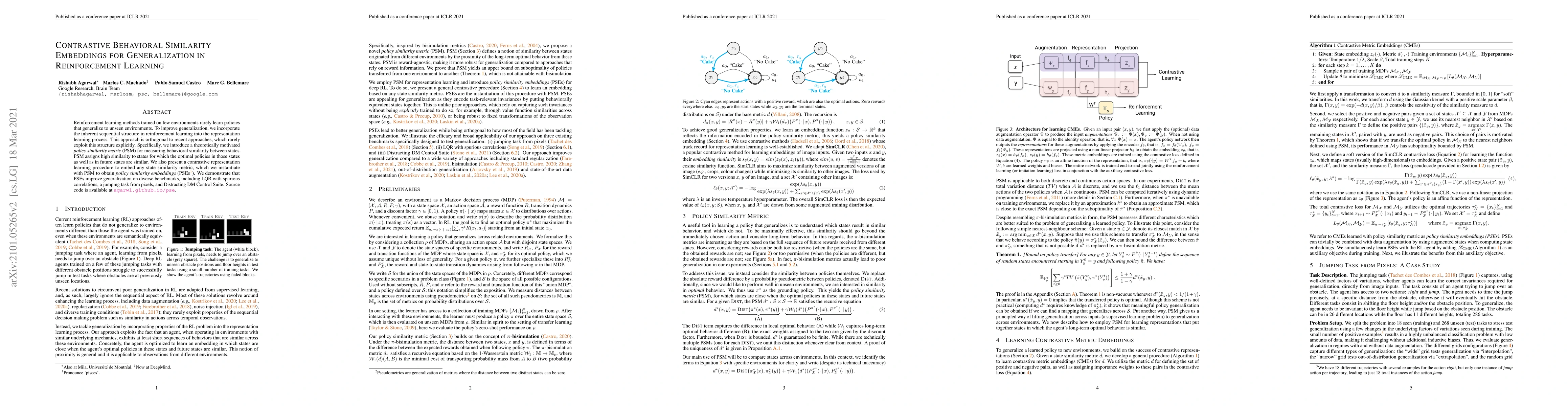 This paper proposes a method to enhance generalization in reinforcement learning by embedding policy similarity metrics into representation learning. It introduces a contrastive behavioral similarity embedding technique using a policy similarity metric (PSM) to improve policy transfer across unseen environments, demonstrating effectiveness across various benchmarks.