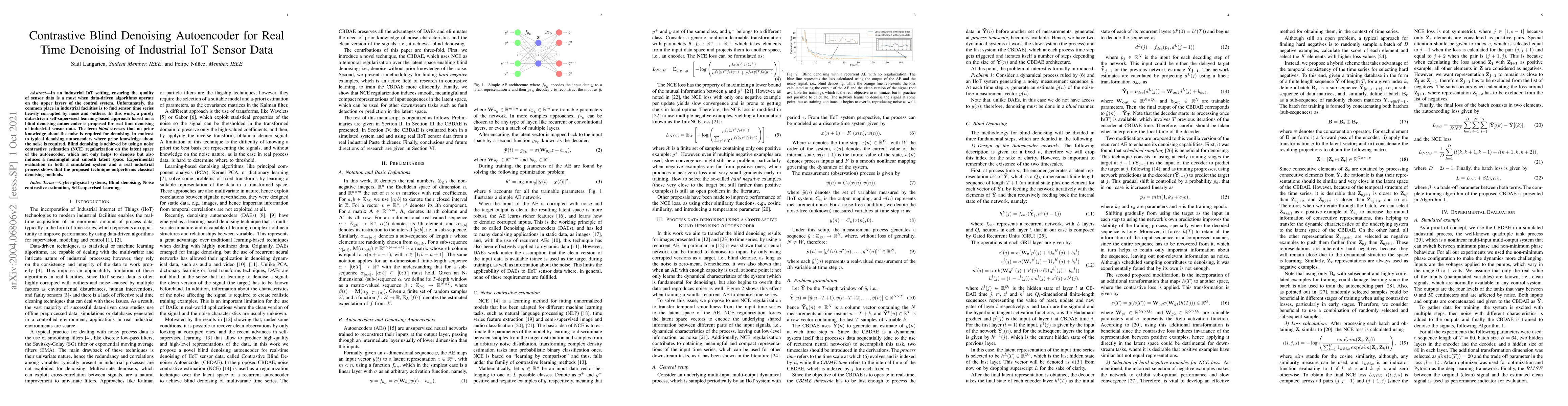 This paper proposes a self-supervised learning approach using a blind denoising autoencoder for real-time denoising of industrial IoT sensor data, achieving superior performance over classical methods without requiring prior knowledge of the noise. The method employs noise contrastive estimation to induce a meaningful latent space.