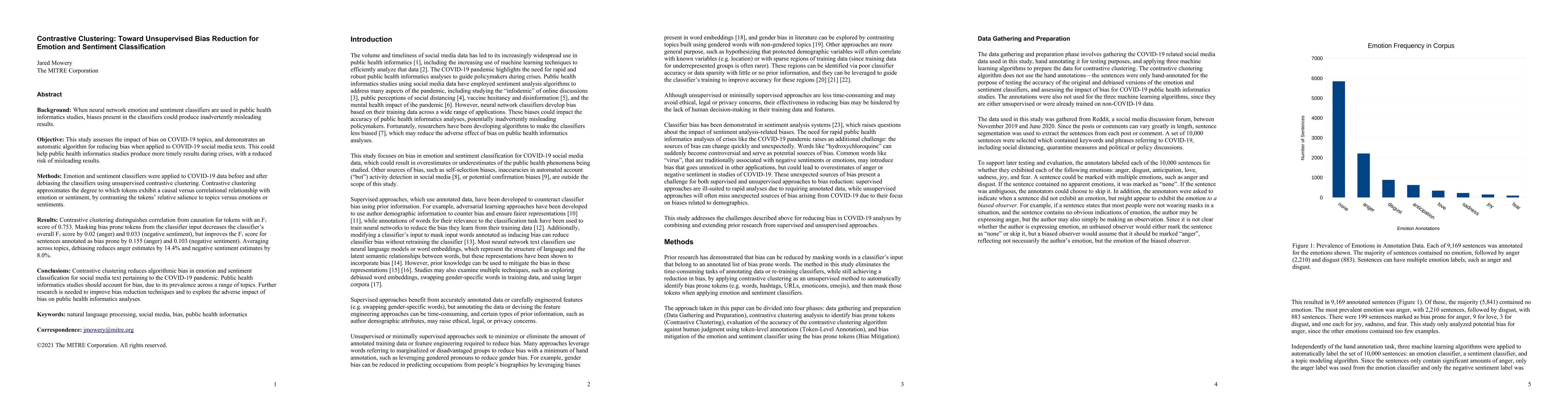 This study introduces contrastive clustering to reduce bias in emotion and sentiment classifiers applied to COVID-19 social media data, achieving a notable reduction in anger and negative sentiment estimates. The method distinguishes causal from correlational relationships, improving classifier accuracy for bias-prone sentences.
