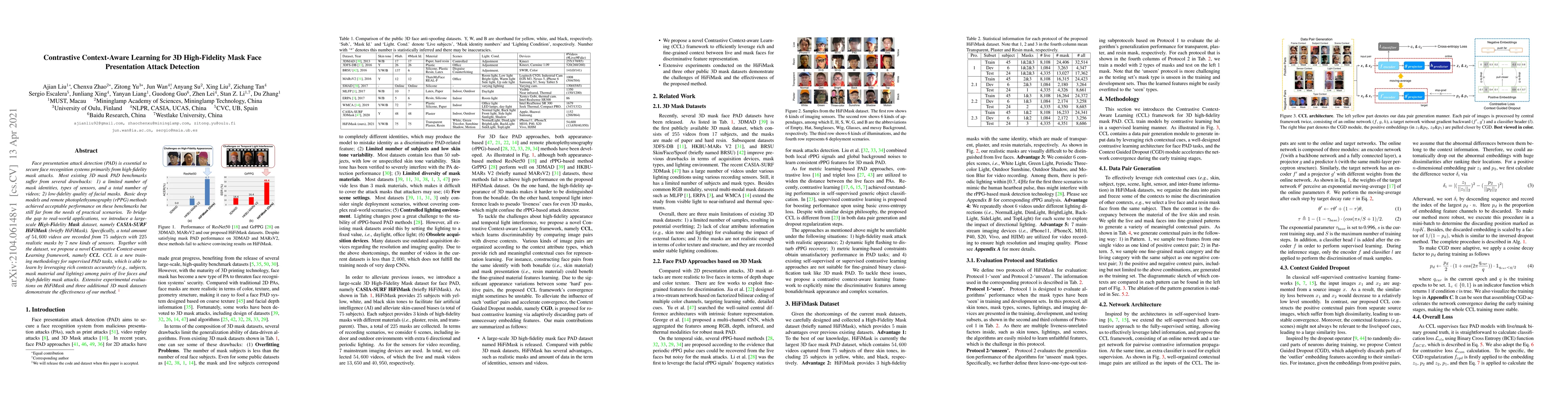 This paper introduces a large-scale High-Fidelity Mask dataset, CASIA-SURF HiFiMask, and a novel Contrastive Context-aware Learning (CCL) framework for 3D mask Presentation Attack Detection. The CCL framework leverages rich contextual information to improve detection accuracy for high-fidelity mask attacks.