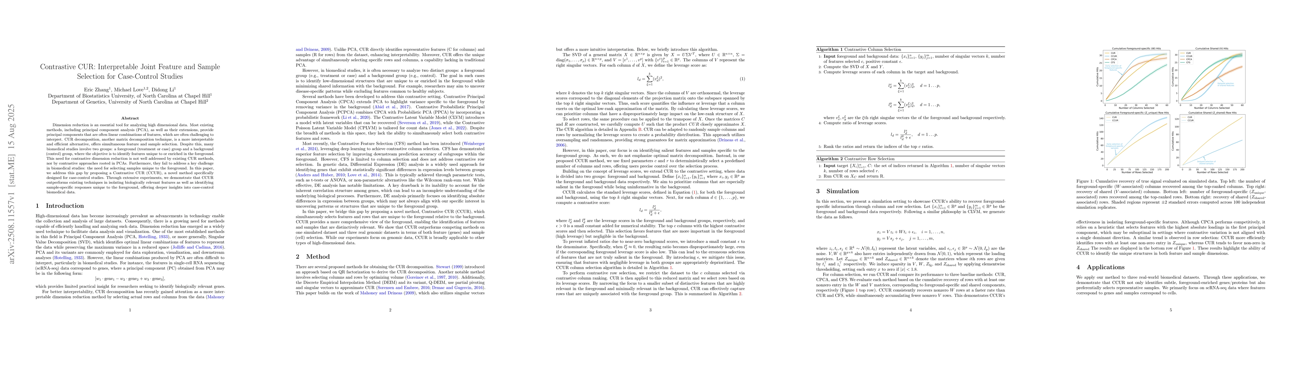 Dimension reduction is an essential tool for analyzing high dimensional data. Most existing methods, including principal component analysis (PCA), as well as their extensions, provide principal components that are often linear combinations of features, which are often challenging to interpret. CUR decomposition, another matrix decomposition technique, is a more interpretable and efficient alternative, offers simultaneous feature and sample selection. Despite this, many biomedical studies involve two groups: a foreground (treatment or case) group and a background (control) group, where the objective is to identify features unique to or enriched in the foreground. This need for contrastive dimension reduction is not well addressed by existing CUR methods, nor by contrastive approaches rooted in PCAs. Furthermore, they fail to address a key challenge in biomedical studies: the need for selecting samples unique to the foreground. In this paper, we address this gap by proposing a Contrastive CUR (CCUR), a novel method specifically designed for case-control studies. Through extensive experiments, we demonstrate that CCUR outperforms existing techniques in isolating biologically relevant features as well as identifying sample-specific responses unique to the foreground, offering deeper insights into case-control biomedical data.