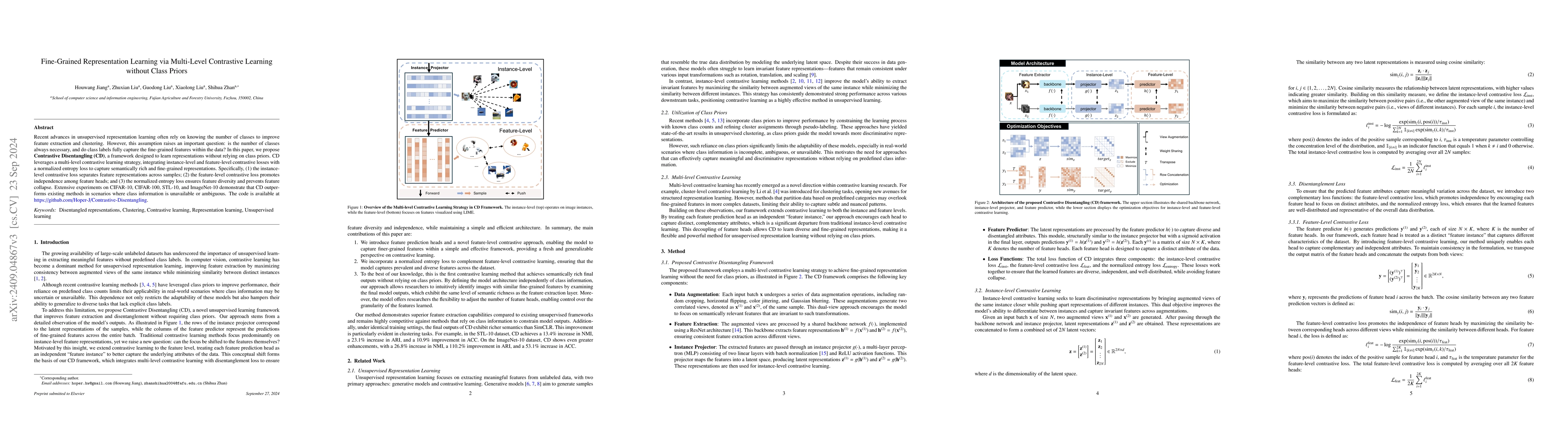 This paper proposes Contrastive Disentangling (CD), a framework for fine-grained representation learning using multi-level contrastive learning without relying on class priors. CD employs instance-level, feature-level losses, and a normalized entropy loss to achieve semantically rich representations, outperforming existing methods on benchmark datasets.