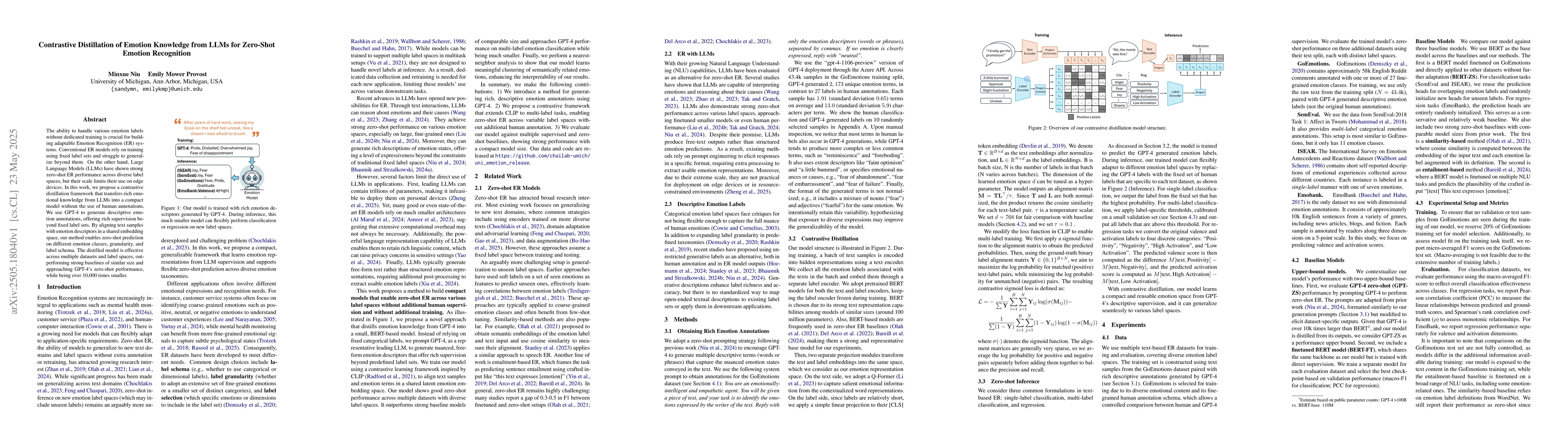 This paper proposes a contrastive distillation framework that transfers emotional knowledge from large language models to compact models for zero-shot emotion recognition, achieving strong performance while being over 10,000 times smaller than the original model.