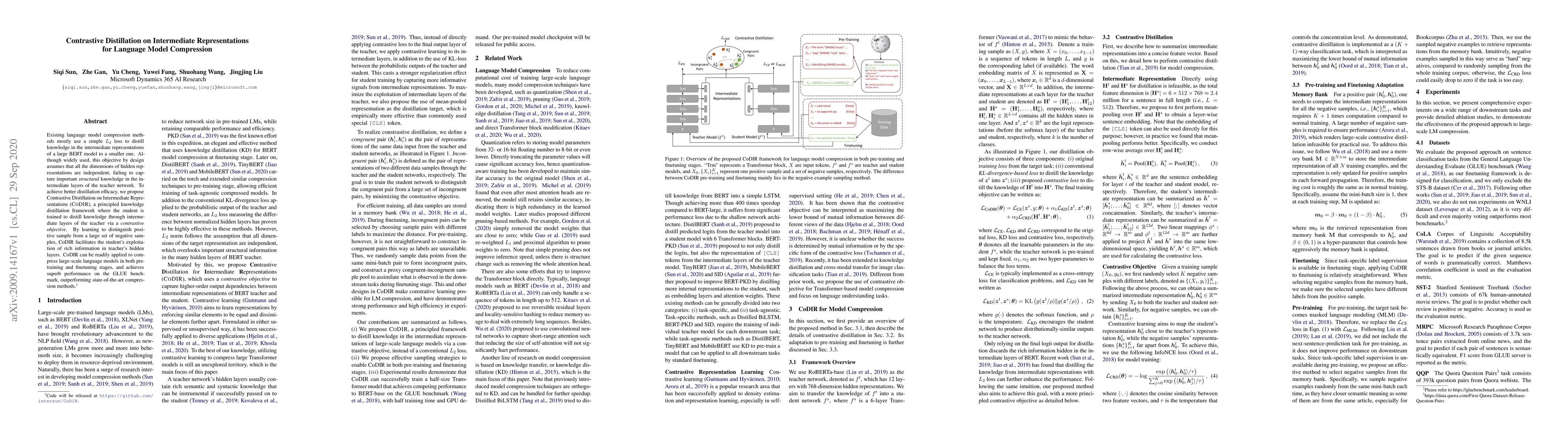 This paper proposes Contrastive Distillation on Intermediate Representations (CoDIR) to improve language model compression by distilling knowledge through intermediate layers using a contrastive objective, outperforming existing methods on the GLUE benchmark. CoDIR trains the student model to distinguish positive samples from negative samples, enhancing the exploitation of rich information in the teacher's hidden layers.