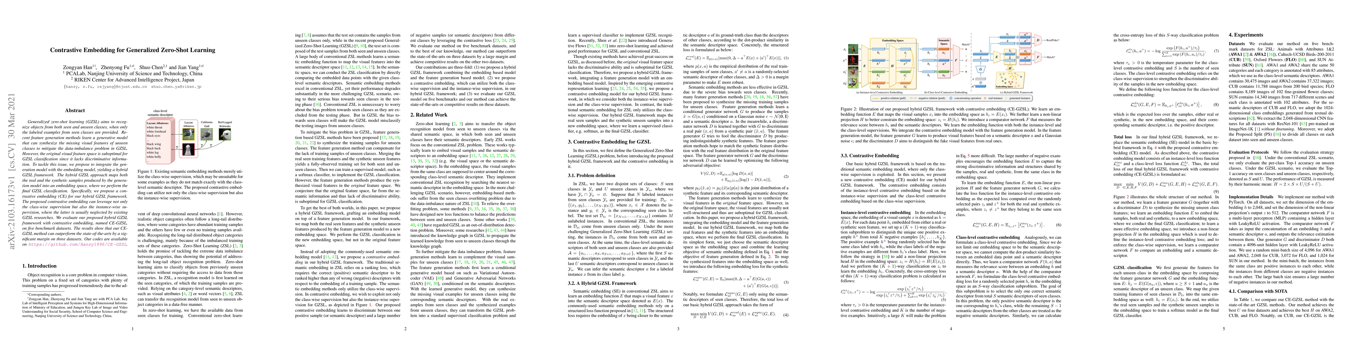 This paper proposes a hybrid framework for generalized zero-shot learning (GZSL) that integrates a generative model with an embedding model to map both real and synthetic samples into a discriminative embedding space. The introduced contrastive embedding leverages both class-wise and instance-wise supervision, outperforming state-of-the-art methods on multiple benchmark datasets.