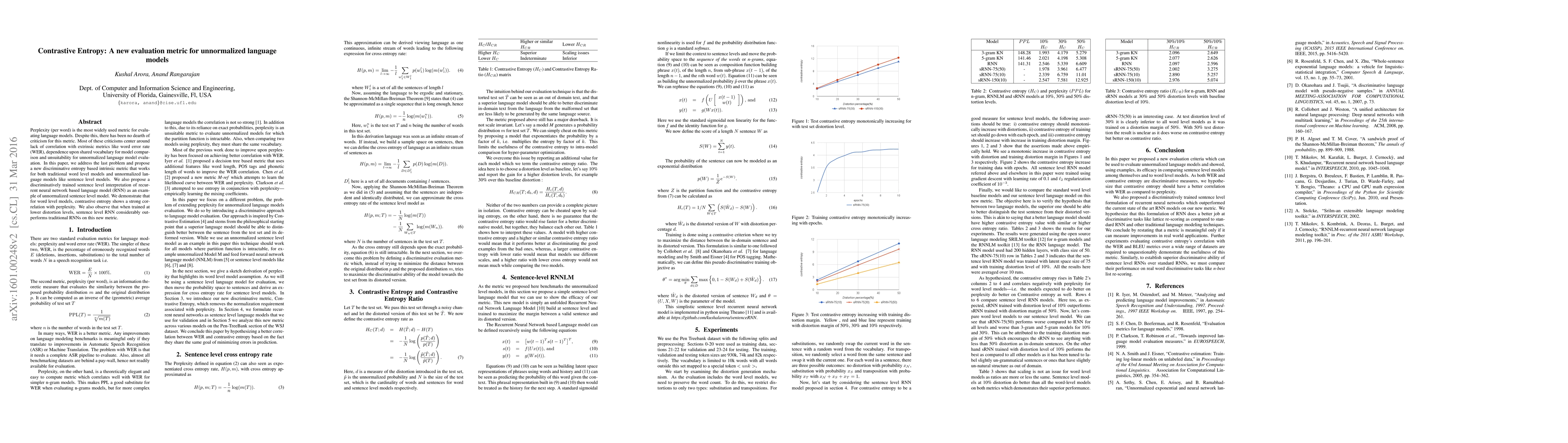 This paper introduces contrastive entropy as a new intrinsic evaluation metric for unnormalized language models, addressing the limitations of perplexity. It demonstrates that contrastive entropy correlates well with perplexity for word-level models and shows that sentence-level RNNs outperform traditional RNNs when trained at lower distortion levels.
