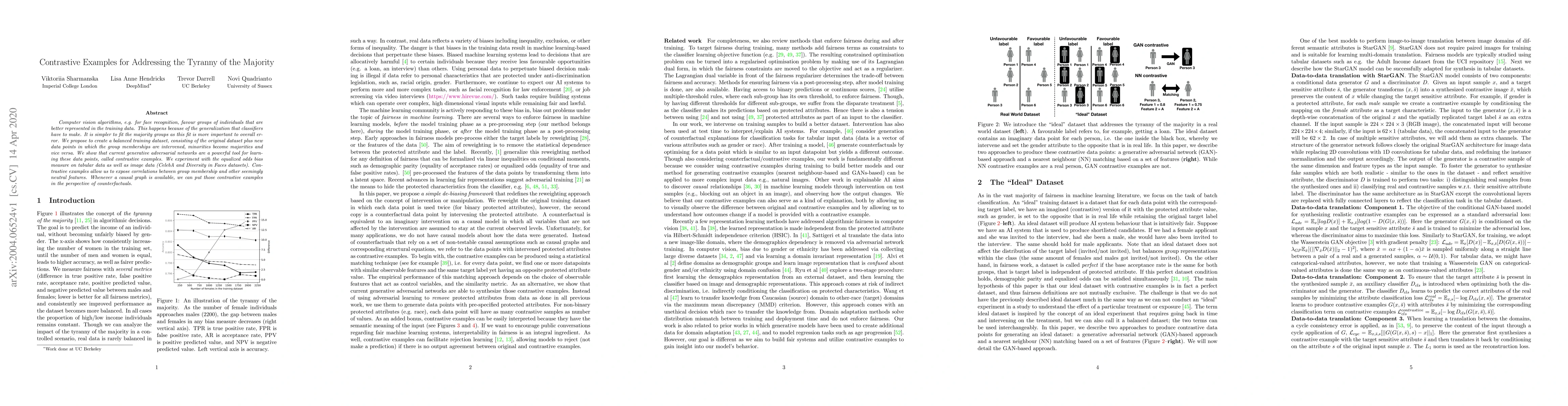 Computer vision algorithms, e.g. for face recognition, favour groups of individuals that are better represented in the training data. This happens because of the generalization that classifiers have to make. It is simpler to fit the majority groups as this fit is more important to overall error. We propose to create a balanced training dataset, consisting of the original dataset plus new data points in which the group memberships are intervened, minorities become majorities and vice versa. We show that current generative adversarial networks are a powerful tool for learning these data points, called contrastive examples. We experiment with the equalized odds bias measure on tabular data as well as image data (CelebA and Diversity in Faces datasets). Contrastive examples allow us to expose correlations between group membership and other seemingly neutral features. Whenever a causal graph is available, we can put those contrastive examples in the perspective of counterfactuals.