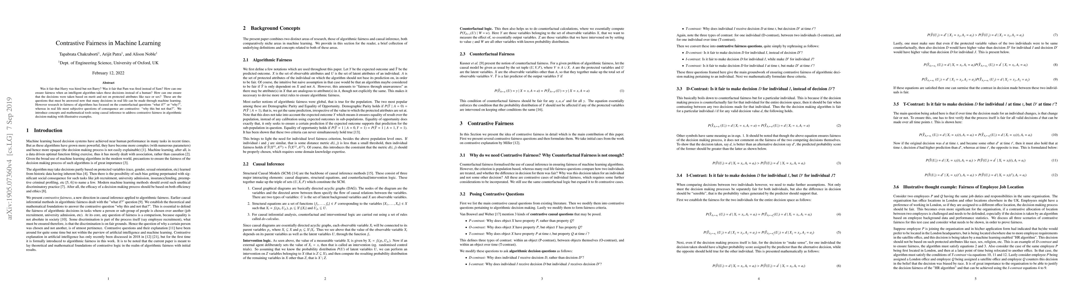 This paper explores the concept of contrastive fairness in machine learning, addressing the practical question of why certain individuals are chosen or rejected by algorithms. It introduces causal inference tools to ensure decisions are based on merit rather than protected attributes, contrasting with existing research focused on counterfactual questions.