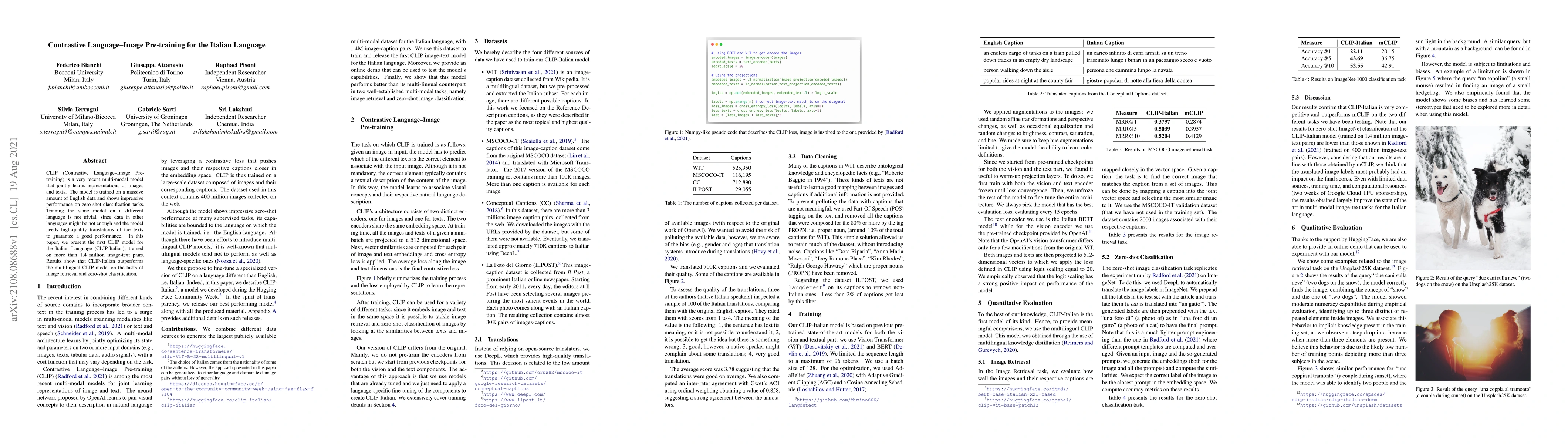 This paper introduces CLIP-Italian, the first Italian language version of the CLIP model, trained on over 1.4 million image-text pairs. CLIP-Italian outperforms the multilingual CLIP model in image retrieval and zero-shot classification tasks.