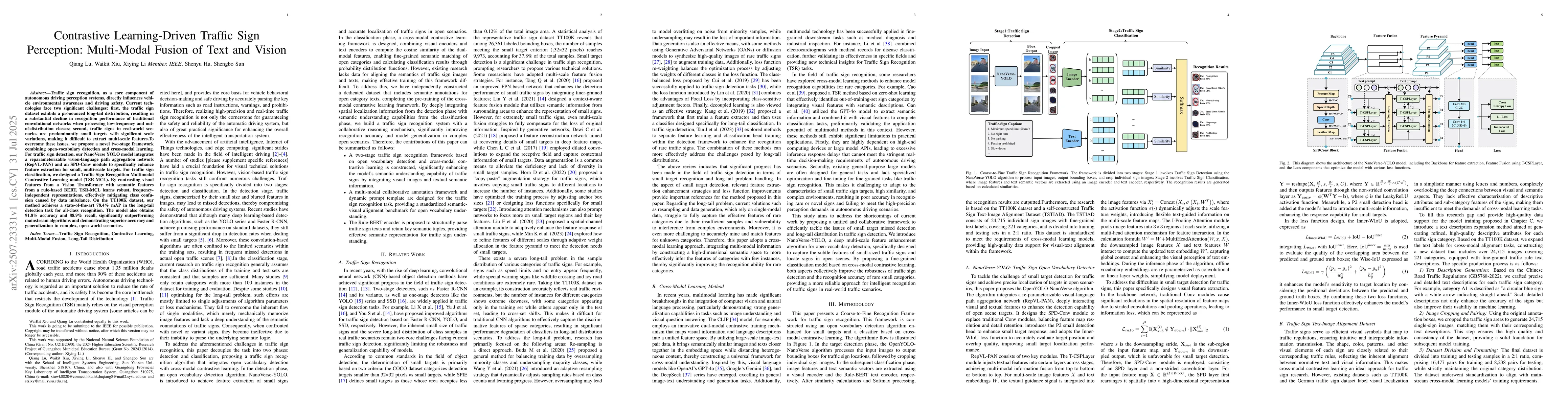 Traffic sign recognition, as a core component of autonomous driving perception systems, directly influences vehicle environmental awareness and driving safety. Current technologies face two significant challenges: first, the traffic sign dataset exhibits a pronounced long-tail distribution, resulting in a substantial decline in recognition performance of traditional convolutional networks when processing low-frequency and out-of-distribution classes; second, traffic signs in real-world scenarios are predominantly small targets with significant scale variations, making it difficult to extract multi-scale features.To overcome these issues, we propose a novel two-stage framework combining open-vocabulary detection and cross-modal learning. For traffic sign detection, our NanoVerse YOLO model integrates a reparameterizable vision-language path aggregation network (RepVL-PAN) and an SPD-Conv module to specifically enhance feature extraction for small, multi-scale targets. For traffic sign classification, we designed a Traffic Sign Recognition Multimodal Contrastive Learning model (TSR-MCL). By contrasting visual features from a Vision Transformer with semantic features from a rule-based BERT, TSR-MCL learns robust, frequency-independent representations, effectively mitigating class confusion caused by data imbalance. On the TT100K dataset, our method achieves a state-of-the-art 78.4% mAP in the long-tail detection task for all-class recognition. The model also obtains 91.8% accuracy and 88.9% recall, significantly outperforming mainstream algorithms and demonstrating superior accuracy and generalization in complex, open-world scenarios.