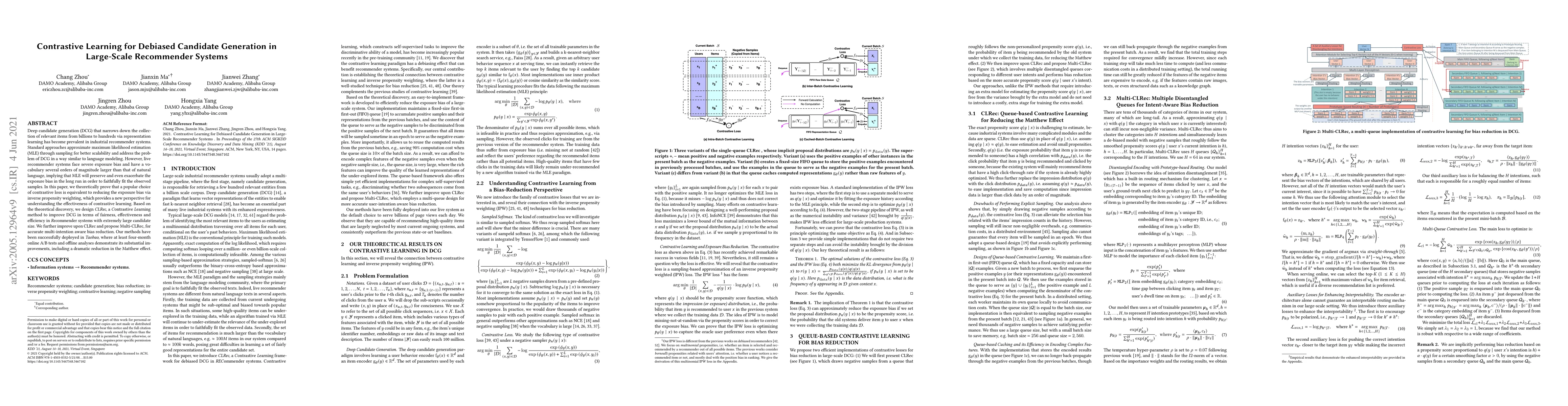 Deep candidate generation (DCG) that narrows down the collection of relevant items from billions to hundreds via representation learning has become prevalent in industrial recommender systems. Standard approaches approximate maximum likelihood estimation (MLE) through sampling for better scalability and address the problem of DCG in a way similar to language modeling. However, live recommender systems face severe exposure bias and have a vocabulary several orders of magnitude larger than that of natural language, implying that MLE will preserve and even exacerbate the exposure bias in the long run in order to faithfully fit the observed samples. In this paper, we theoretically prove that a popular choice of contrastive loss is equivalent to reducing the exposure bias via inverse propensity weighting, which provides a new perspective for understanding the effectiveness of contrastive learning. Based on the theoretical discovery, we design CLRec, a contrastive learning method to improve DCG in terms of fairness, effectiveness and efficiency in recommender systems with extremely large candidate size. We further improve upon CLRec and propose Multi-CLRec, for accurate multi-intention aware bias reduction. Our methods have been successfully deployed in Taobao, where at least four-month online A/B tests and offline analyses demonstrate its substantial improvements, including a dramatic reduction in the Matthew effect.