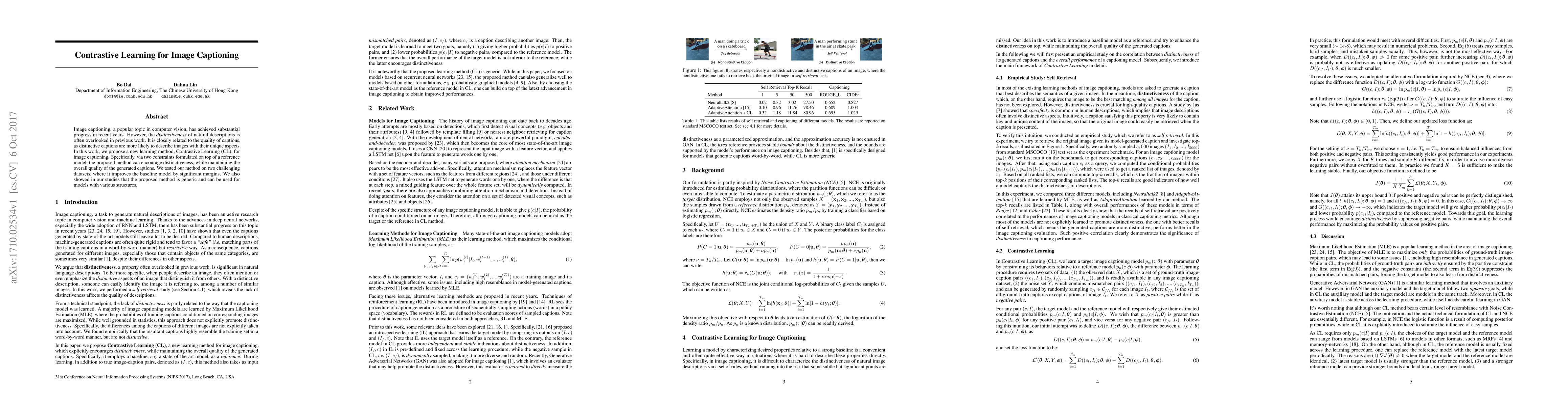 This paper introduces Contrastive Learning (CL) for enhancing image captioning by promoting distinctiveness in descriptions while preserving caption quality. The proposed method, tested on two datasets, significantly outperforms baseline models and demonstrates general applicability across different model structures.