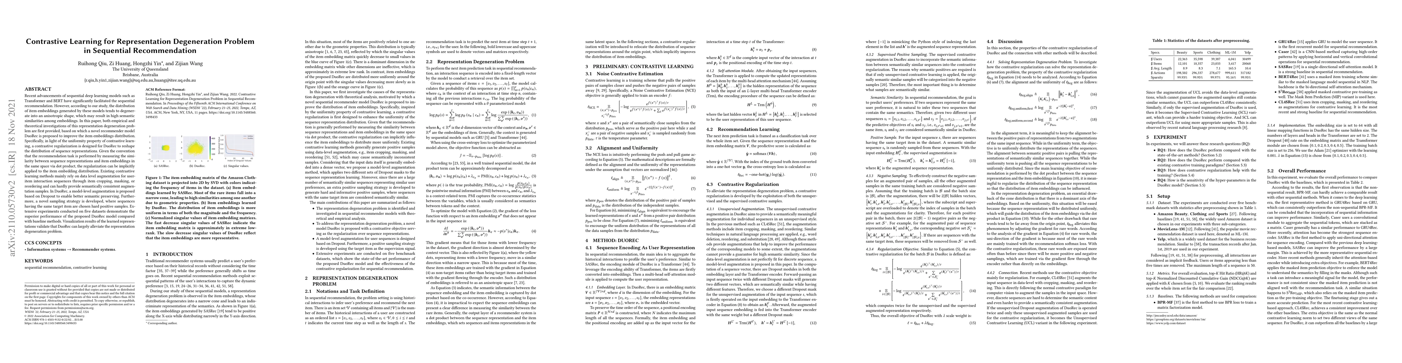 This paper investigates the representation degeneration problem in sequential recommendation models, proposing DuoRec to address it. DuoRec introduces contrastive regularization and model-level augmentation to reshape item embeddings, significantly improving recommendation performance and alleviating representation degeneration.