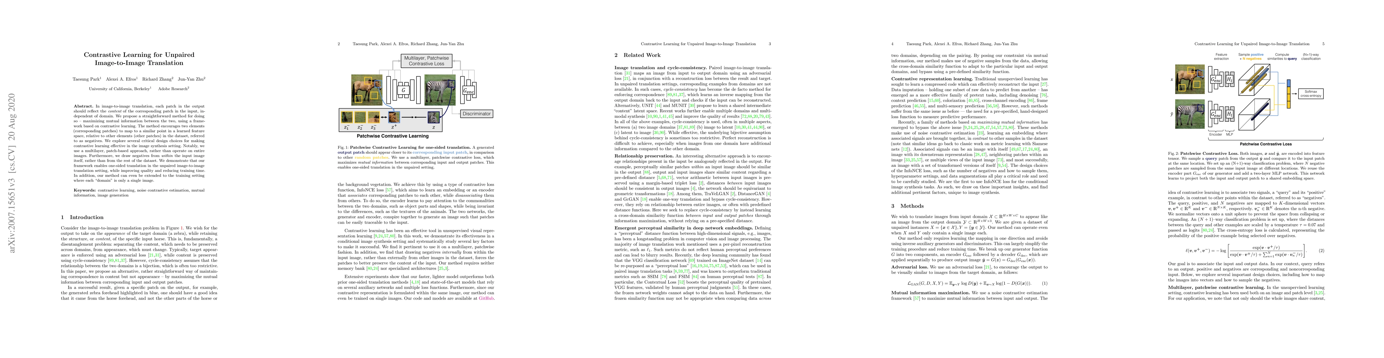 This paper proposes a contrastive learning framework for unpaired image-to-image translation, focusing on maximizing mutual information between corresponding patches in input and output. The method uses a patch-based approach and draws negatives from within the input image, enhancing translation quality and reducing training time.