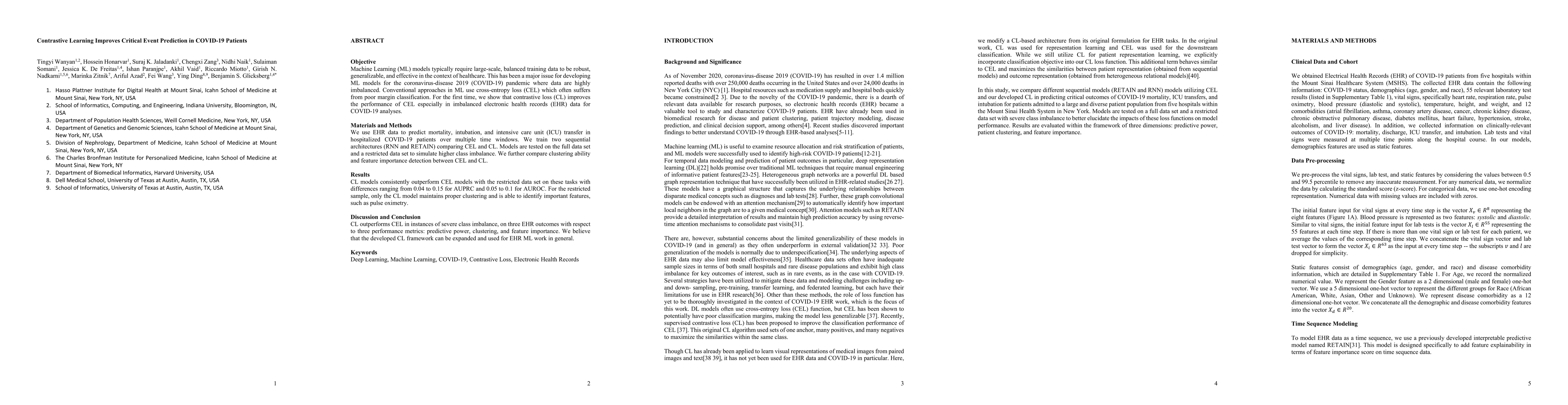 Machine Learning (ML) models typically require large-scale, balanced training data to be robust, generalizable, and effective in the context of healthcare. This has been a major issue for developing ML models for the coronavirus-disease 2019 (COVID-19) pandemic where data is highly imbalanced, particularly within electronic health records (EHR) research. Conventional approaches in ML use cross-entropy loss (CEL) that often suffers from poor margin classification. For the first time, we show that contrastive loss (CL) improves the performance of CEL especially for imbalanced EHR data and the related COVID-19 analyses. This study has been approved by the Institutional Review Board at the Icahn School of Medicine at Mount Sinai. We use EHR data from five hospitals within the Mount Sinai Health System (MSHS) to predict mortality, intubation, and intensive care unit (ICU) transfer in hospitalized COVID-19 patients over 24 and 48 hour time windows. We train two sequential architectures (RNN and RETAIN) using two loss functions (CEL and CL). Models are tested on full sample data set which contain all available data and restricted data set to emulate higher class imbalance.CL models consistently outperform CEL models with the restricted data set on these tasks with differences ranging from 0.04 to 0.15 for AUPRC and 0.05 to 0.1 for AUROC. For the restricted sample, only the CL model maintains proper clustering and is able to identify important features, such as pulse oximetry. CL outperforms CEL in instances of severe class imbalance, on three EHR outcomes with respect to three performance metrics: predictive power, clustering, and feature importance. We believe that the developed CL framework can be expanded and used for EHR ML work in general.