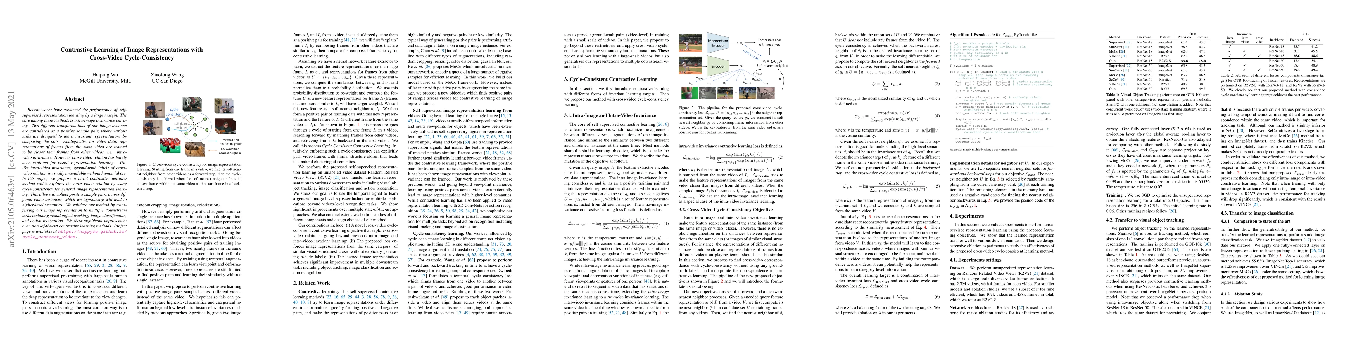 This paper introduces a novel contrastive learning method that leverages cross-video cycle-consistency to explore relationships between frames from different videos, aiming to improve general image representation learning. The proposed method shows significant improvement over existing methods in downstream tasks like object tracking, classification, and action recognition.