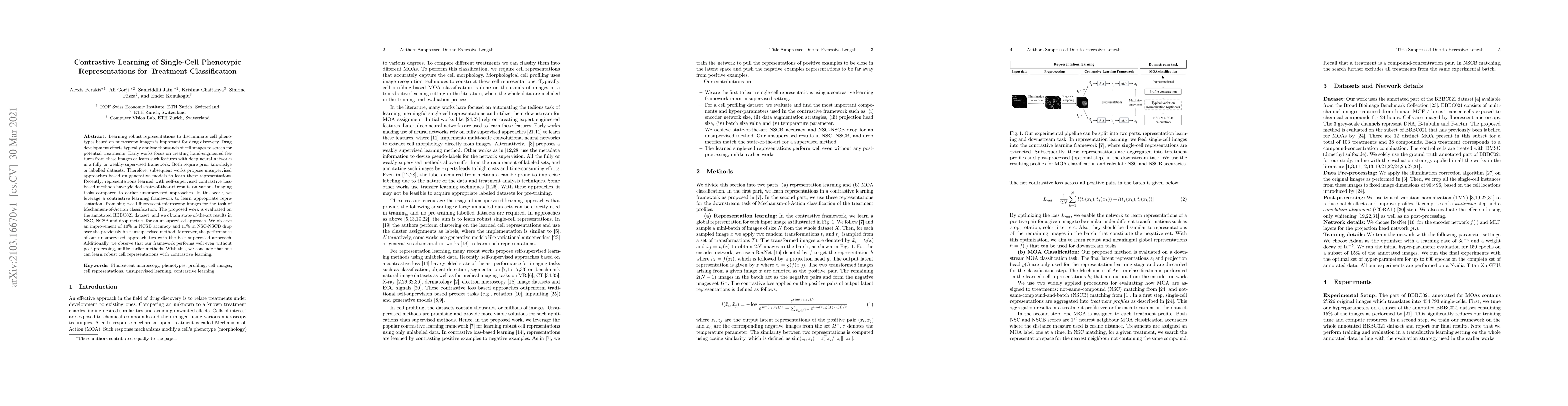 Learning robust representations to discriminate cell phenotypes based on microscopy images is important for drug discovery. Drug development efforts typically analyse thousands of cell images to screen for potential treatments. Early works focus on creating hand-engineered features from these images or learn such features with deep neural networks in a fully or weakly-supervised framework. Both require prior knowledge or labelled datasets. Therefore, subsequent works propose unsupervised approaches based on generative models to learn these representations. Recently, representations learned with self-supervised contrastive loss-based methods have yielded state-of-the-art results on various imaging tasks compared to earlier unsupervised approaches. In this work, we leverage a contrastive learning framework to learn appropriate representations from single-cell fluorescent microscopy images for the task of Mechanism-of-Action classification. The proposed work is evaluated on the annotated BBBC021 dataset, and we obtain state-of-the-art results in NSC, NCSB and drop metrics for an unsupervised approach. We observe an improvement of 10% in NCSB accuracy and 11% in NSC-NSCB drop over the previously best unsupervised method. Moreover, the performance of our unsupervised approach ties with the best supervised approach. Additionally, we observe that our framework performs well even without post-processing, unlike earlier methods. With this, we conclude that one can learn robust cell representations with contrastive learning.