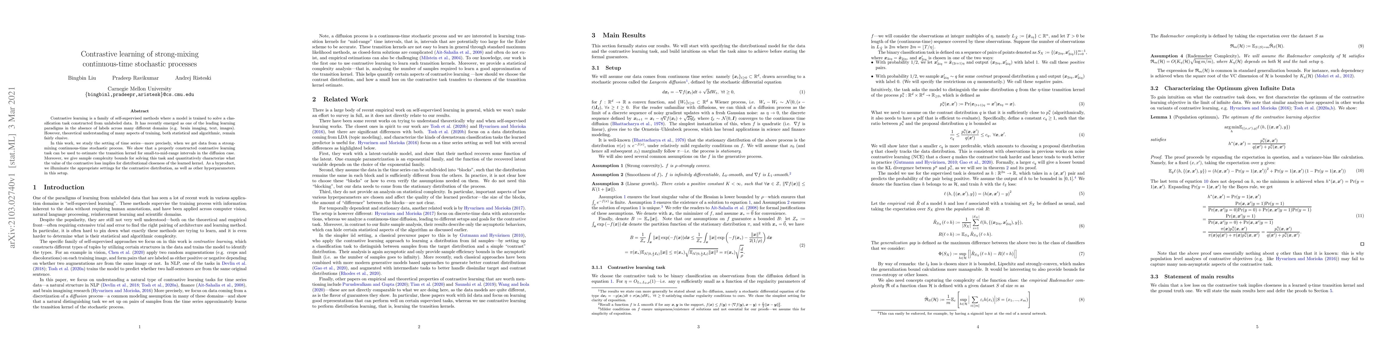 Contrastive learning is a family of self-supervised methods where a model is trained to solve a classification task constructed from unlabeled data. It has recently emerged as one of the leading learning paradigms in the absence of labels across many different domains (e.g. brain imaging, text, images). However, theoretical understanding of many aspects of training, both statistical and algorithmic, remain fairly elusive. In this work, we study the setting of time series -- more precisely, when we get data from a strong-mixing continuous-time stochastic process. We show that a properly constructed contrastive learning task can be used to estimate the transition kernel for small-to-mid-range intervals in the diffusion case. Moreover, we give sample complexity bounds for solving this task and quantitatively characterize what the value of the contrastive loss implies for distributional closeness of the learned kernel. As a byproduct, we illuminate the appropriate settings for the contrastive distribution, as well as other hyperparameters in this setup.