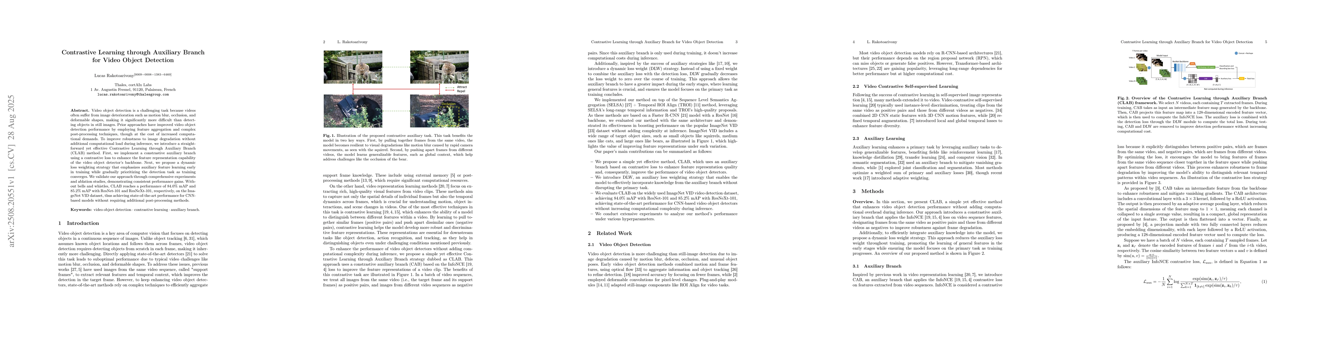 Video object detection is a challenging task because videos often suffer from image deterioration such as motion blur, occlusion, and deformable shapes, making it significantly more difficult than detecting objects in still images. Prior approaches have improved video object detection performance by employing feature aggregation and complex post-processing techniques, though at the cost of increased computational demands. To improve robustness to image degradation without additional computational load during inference, we introduce a straightforward yet effective Contrastive Learning through Auxiliary Branch (CLAB) method. First, we implement a constrastive auxiliary branch using a contrastive loss to enhance the feature representation capability of the video object detector's backbone. Next, we propose a dynamic loss weighting strategy that emphasizes auxiliary feature learning early in training while gradually prioritizing the detection task as training converges. We validate our approach through comprehensive experiments and ablation studies, demonstrating consistent performance gains. Without bells and whistles, CLAB reaches a performance of 84.0% mAP and 85.2% mAP with ResNet-101 and ResNeXt-101, respectively, on the ImageNet VID dataset, thus achieving state-of-the-art performance for CNN-based models without requiring additional post-processing methods.