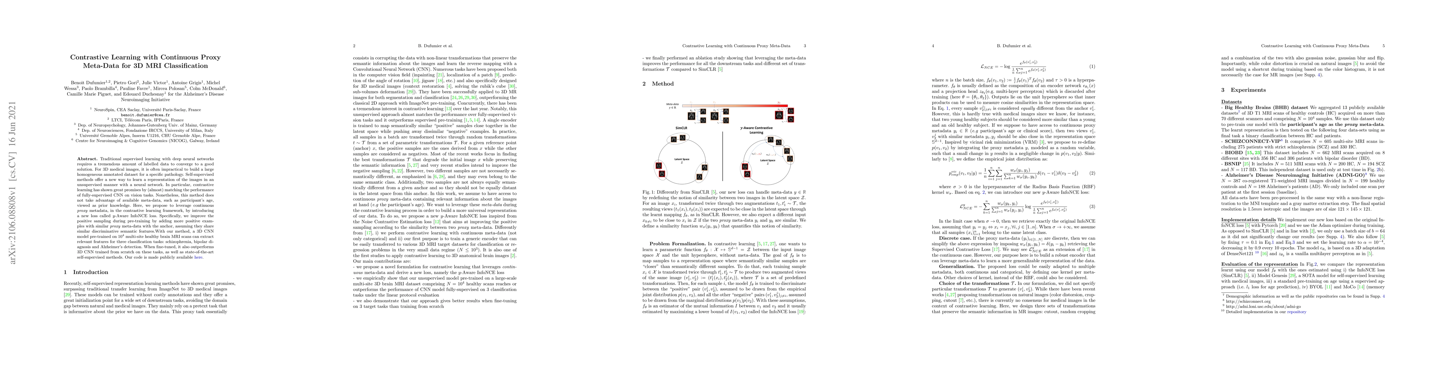 This paper proposes a contrastive learning method that leverages continuous proxy meta-data to improve self-supervised representation learning for 3D MRI classification. The method introduces a y-Aware InfoNCE loss to enhance positive sampling, leading to better feature extraction for schizophrenia, bipolar diagnosis, and Alzheimer's detection tasks.