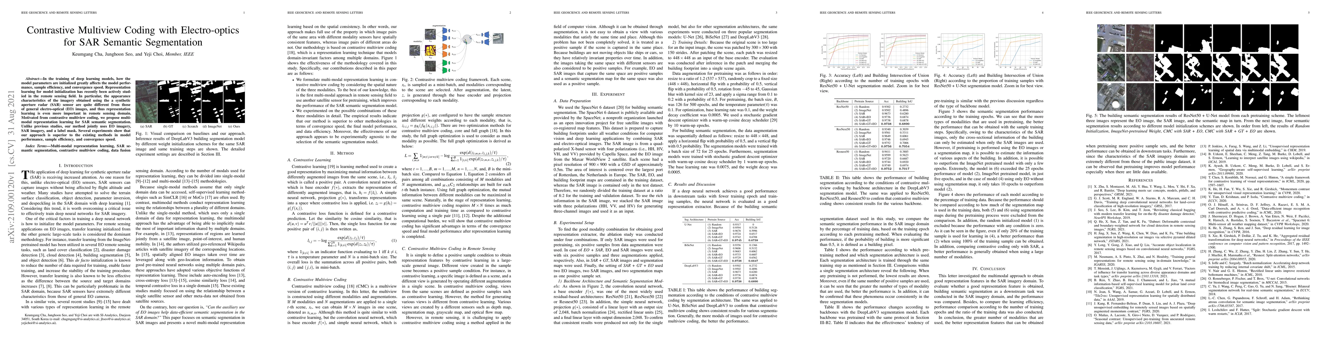 In the training of deep learning models, how the model parameters are initialized greatly affects the model performance, sample efficiency, and convergence speed. Representation learning for model initialization has recently been actively studied in the remote sensing field. In particular, the appearance characteristics of the imagery obtained using the a synthetic aperture radar (SAR) sensor are quite different from those of general electro-optical (EO) images, and thus representation learning is even more important in remote sensing domain. Motivated from contrastive multiview coding, we propose multi-modal representation learning for SAR semantic segmentation. Unlike previous studies, our method jointly uses EO imagery, SAR imagery, and a label mask. Several experiments show that our approach is superior to the existing methods in model performance, sample efficiency, and convergence speed.