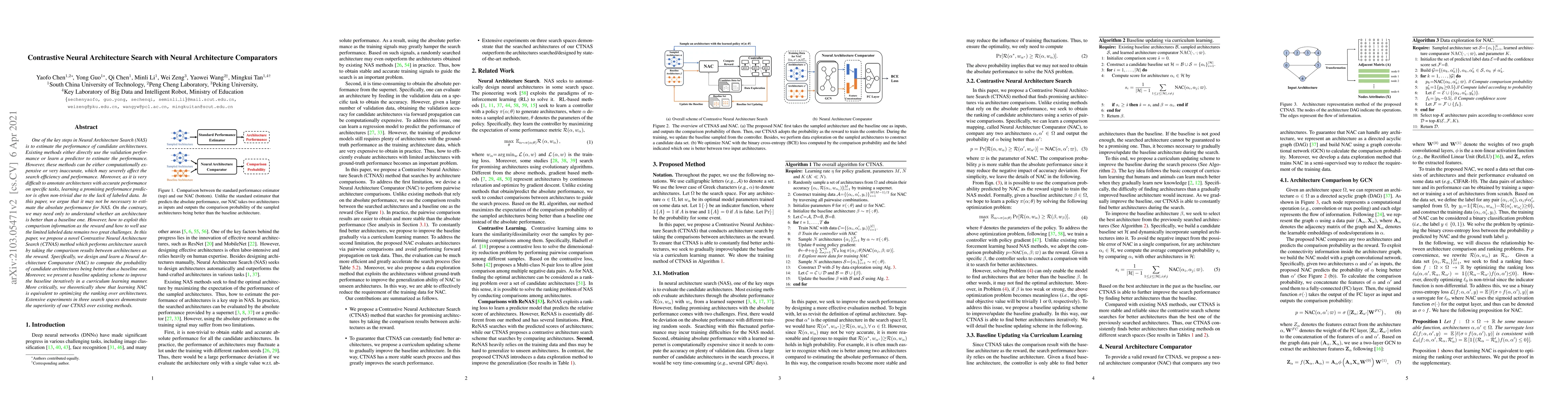 This paper proposes a Contrastive Neural Architecture Search (CTNAS) method that uses a Neural Architecture Comparator (NAC) to determine if a candidate architecture is better than a baseline, rather than estimating absolute performance. The method iteratively updates the baseline and theoretically shows that learning NAC optimizes architecture ranking.
