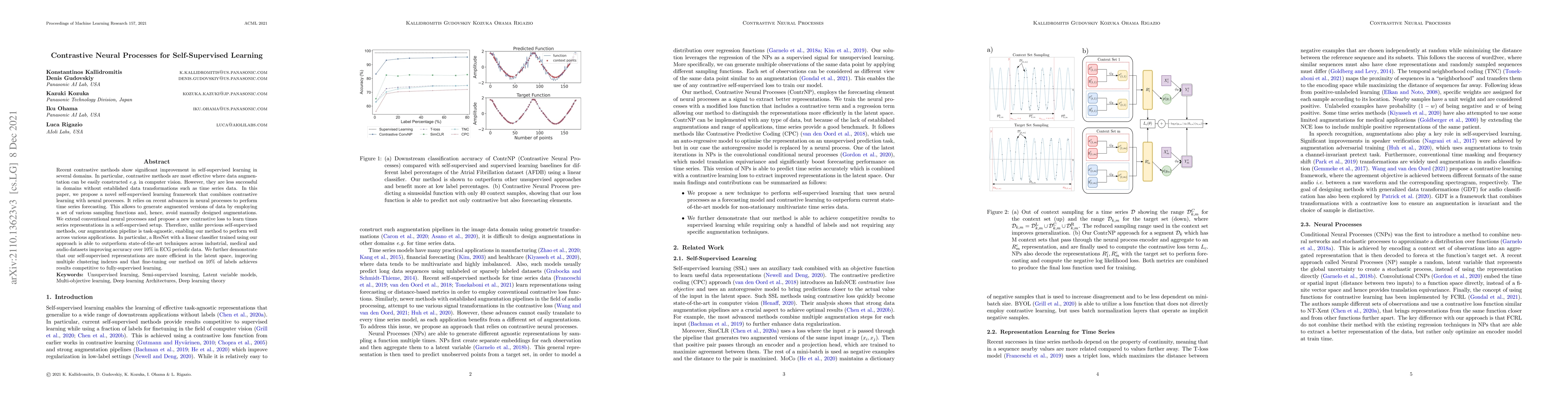 Recent contrastive methods show significant improvement in self-supervised learning in several domains. In particular, contrastive methods are most effective where data augmentation can be easily constructed e.g. in computer vision. However, they are less successful in domains without established data transformations such as time series data. In this paper, we propose a novel self-supervised learning framework that combines contrastive learning with neural processes. It relies on recent advances in neural processes to perform time series forecasting. This allows to generate augmented versions of data by employing a set of various sampling functions and, hence, avoid manually designed augmentations. We extend conventional neural processes and propose a new contrastive loss to learn times series representations in a self-supervised setup. Therefore, unlike previous self-supervised methods, our augmentation pipeline is task-agnostic, enabling our method to perform well across various applications. In particular, a ResNet with a linear classifier trained using our approach is able to outperform state-of-the-art techniques across industrial, medical and audio datasets improving accuracy over 10% in ECG periodic data. We further demonstrate that our self-supervised representations are more efficient in the latent space, improving multiple clustering indexes and that fine-tuning our method on 10% of labels achieves results competitive to fully-supervised learning.