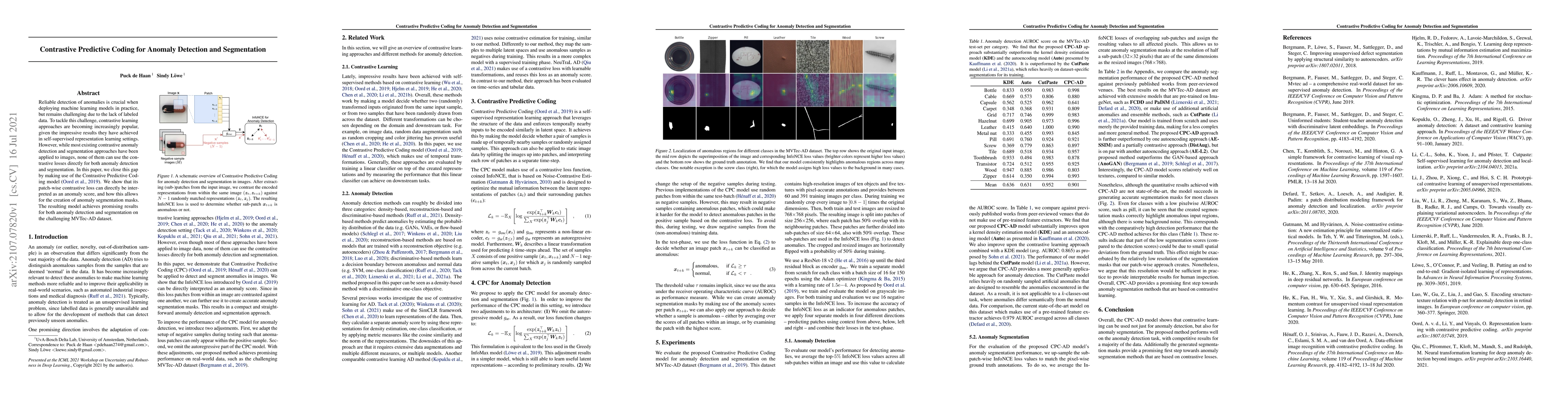 This paper proposes using Contrastive Predictive Coding (CPC) for anomaly detection and segmentation, leveraging its patch-wise contrastive loss as an anomaly score. The model demonstrates effective results for both tasks on the MVTec-AD dataset, addressing the challenge of detecting anomalies without labeled data.