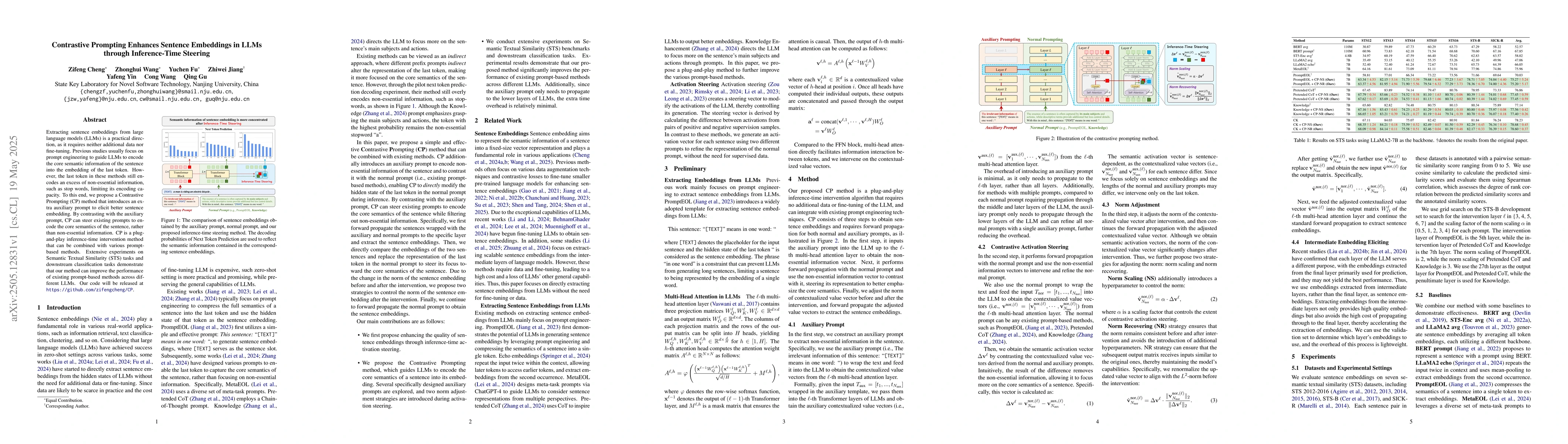 Contrastive Prompting improves sentence embeddings in LLMs by using an auxiliary prompt to steer prompts towards core semantics, enhancing performance across various tasks.