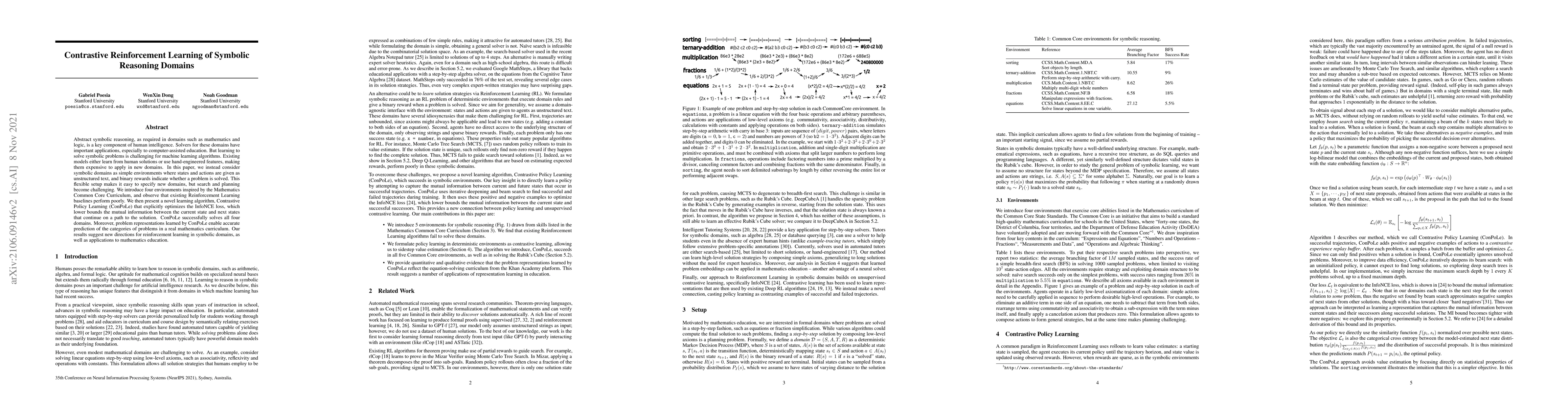 Abstract symbolic reasoning, as required in domains such as mathematics and logic, is a key component of human intelligence. Solvers for these domains have important applications, especially to computer-assisted education. But learning to solve symbolic problems is challenging for machine learning algorithms. Existing models either learn from human solutions or use hand-engineered features, making them expensive to apply in new domains. In this paper, we instead consider symbolic domains as simple environments where states and actions are given as unstructured text, and binary rewards indicate whether a problem is solved. This flexible setup makes it easy to specify new domains, but search and planning become challenging. We introduce four environments inspired by the Mathematics Common Core Curriculum, and observe that existing Reinforcement Learning baselines perform poorly. We then present a novel learning algorithm, Contrastive Policy Learning (ConPoLe) that explicitly optimizes the InfoNCE loss, which lower bounds the mutual information between the current state and next states that continue on a path to the solution. ConPoLe successfully solves all four domains. Moreover, problem representations learned by ConPoLe enable accurate prediction of the categories of problems in a real mathematics curriculum. Our results suggest new directions for reinforcement learning in symbolic domains, as well as applications to mathematics education.
