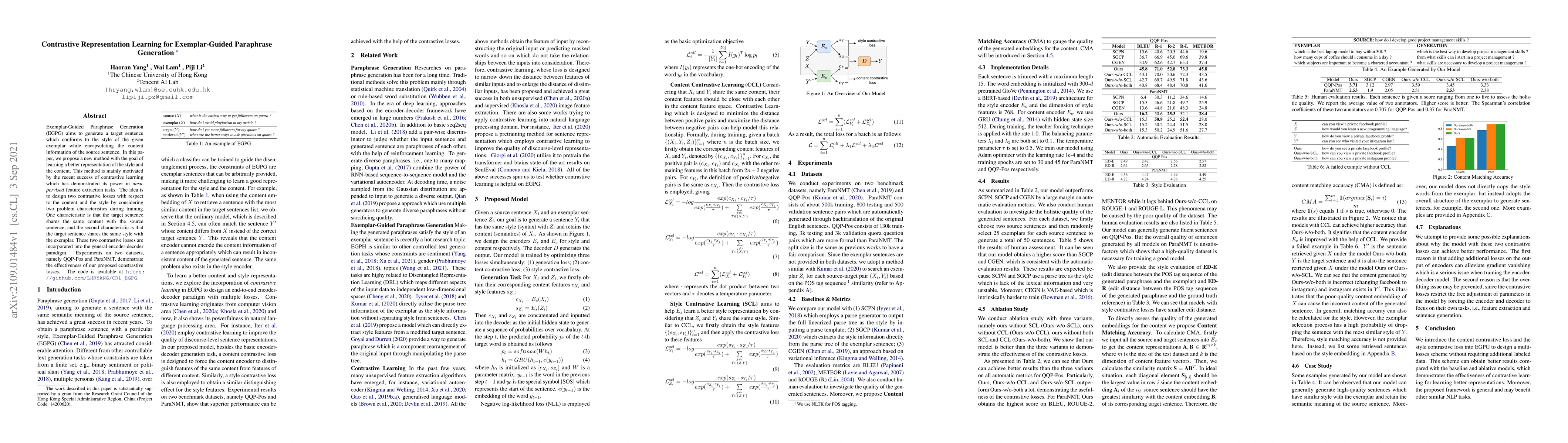 This paper proposes a method for Exemplar-Guided Paraphrase Generation using contrastive representation learning, aiming to improve style and content representation. It introduces two contrastive losses to enforce content and style alignments, demonstrating effectiveness on QQP-Pos and ParaNMT datasets.