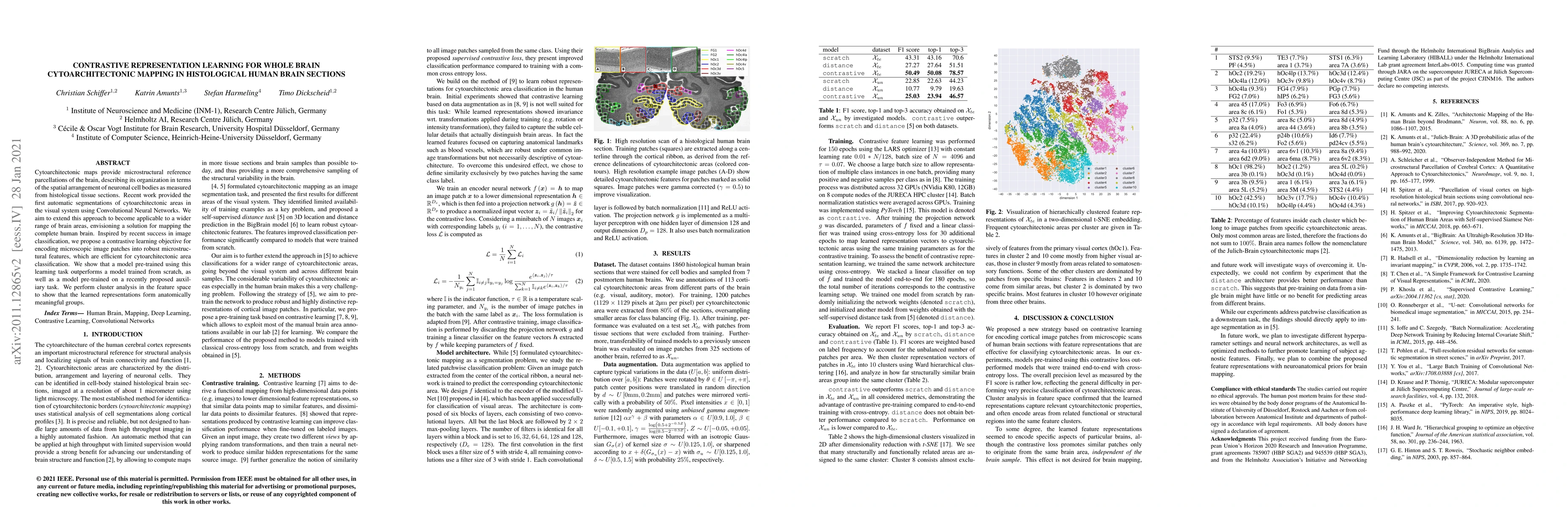 This paper proposes a contrastive learning approach to automatically segment cytoarchitectonic areas in histological human brain sections, aiming to map the entire brain. The method encodes microscopic image patches into robust features for area classification, demonstrating improved performance over models trained from scratch or on auxiliary tasks, and showing anatomically meaningful groupings in feature space.