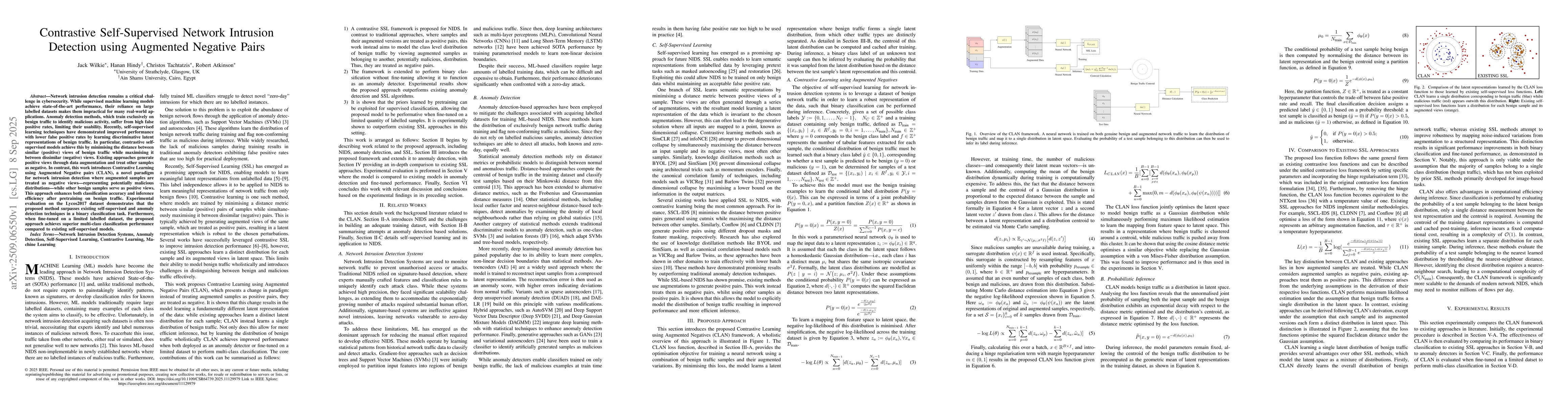 Network intrusion detection remains a critical challenge in cybersecurity. While supervised machine learning models achieve state-of-the-art performance, their reliance on large labelled datasets makes them impractical for many real-world applications. Anomaly detection methods, which train exclusively on benign traffic to identify malicious activity, suffer from high false positive rates, limiting their usability. Recently, self-supervised learning techniques have demonstrated improved performance with lower false positive rates by learning discriminative latent representations of benign traffic. In particular, contrastive self-supervised models achieve this by minimizing the distance between similar (positive) views of benign traffic while maximizing it between dissimilar (negative) views. Existing approaches generate positive views through data augmentation and treat other samples as negative. In contrast, this work introduces Contrastive Learning using Augmented Negative pairs (CLAN), a novel paradigm for network intrusion detection where augmented samples are treated as negative views - representing potentially malicious distributions - while other benign samples serve as positive views. This approach enhances both classification accuracy and inference efficiency after pretraining on benign traffic. Experimental evaluation on the Lycos2017 dataset demonstrates that the proposed method surpasses existing self-supervised and anomaly detection techniques in a binary classification task. Furthermore, when fine-tuned on a limited labelled dataset, the proposed approach achieves superior multi-class classification performance compared to existing self-supervised models.