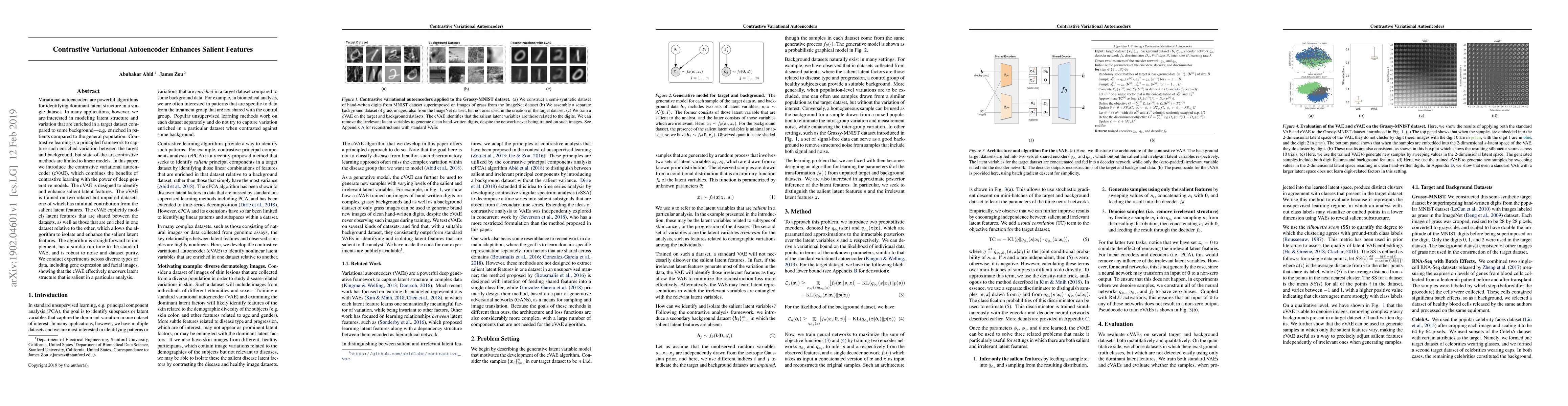 The paper introduces a contrastive variational autoencoder (cVAE) that combines contrastive learning with deep generative models to identify and enhance salient latent features in a target dataset compared to a background dataset. The cVAE effectively isolates enriched latent features across unpaired datasets and demonstrates robustness and effectiveness across various data types.