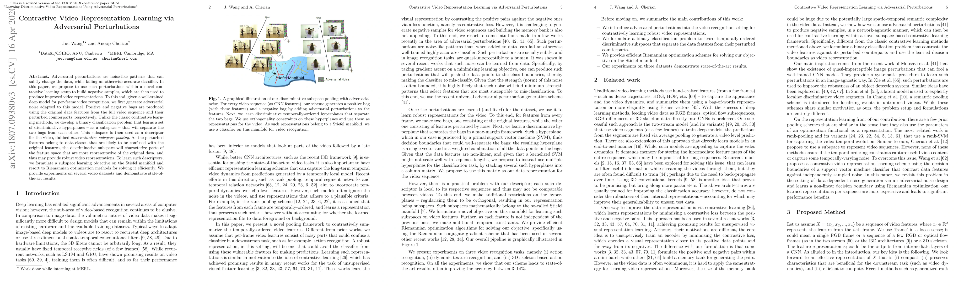 This paper proposes a novel method for learning improved video representations using adversarial perturbations within a contrastive learning framework. It employs discriminative subspace pooling, leveraging a binary classification problem to learn hyperplanes that separate positive and negative bags, ultimately providing robust video representations.