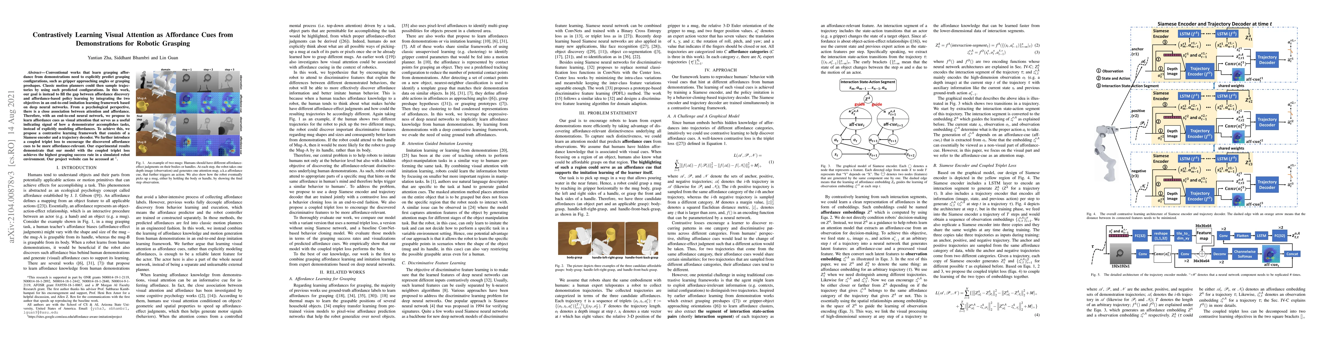 This paper proposes an end-to-end imitation learning framework that uses contrastive learning to discover visual attention cues as affordance signals for robotic grasping, instead of explicitly predicting grasping configurations. The approach achieves higher grasping success rates in simulations by integrating affordance discovery and policy learning.