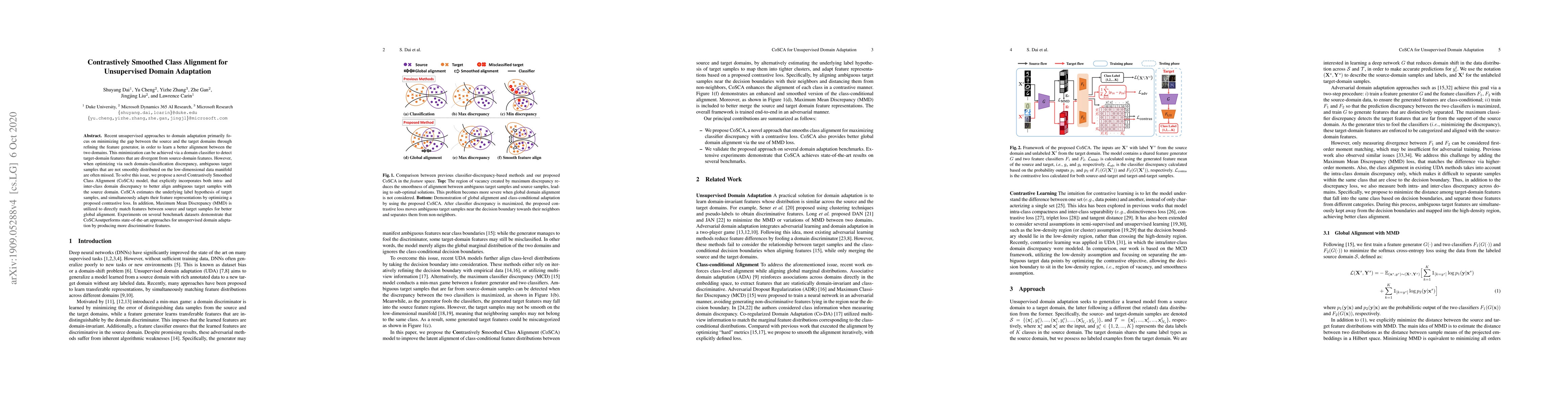 The paper proposes a Contrastively Smoothed Class Alignment (CoSCA) model for unsupervised domain adaptation, which incorporates intra- and inter-class domain discrepancies to better align ambiguous target samples with the source domain. CoSCA uses a contrastive loss and Maximum Mean Discrepancy (MMD) to optimize feature representations, outperforming state-of-the-art methods on benchmark datasets.