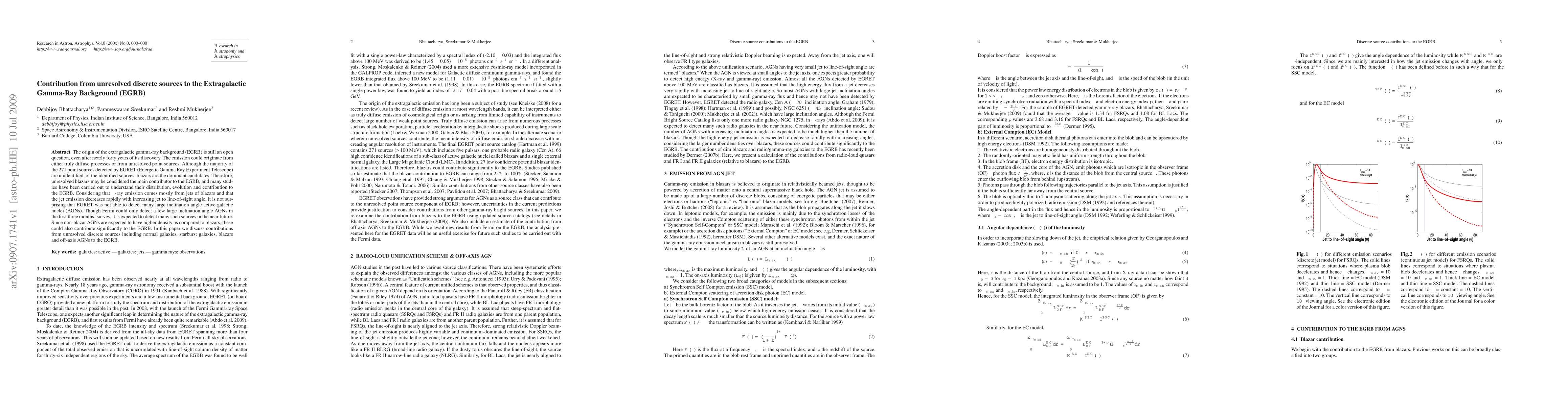 This paper explores the contribution of unresolved discrete sources, including blazars, off-axis AGNs, normal galaxies, and starburst galaxies, to the extragalactic gamma-ray background (EGRB). It emphasizes the potential future detections by the Fermi telescope and the significance of these sources in understanding the EGRB.