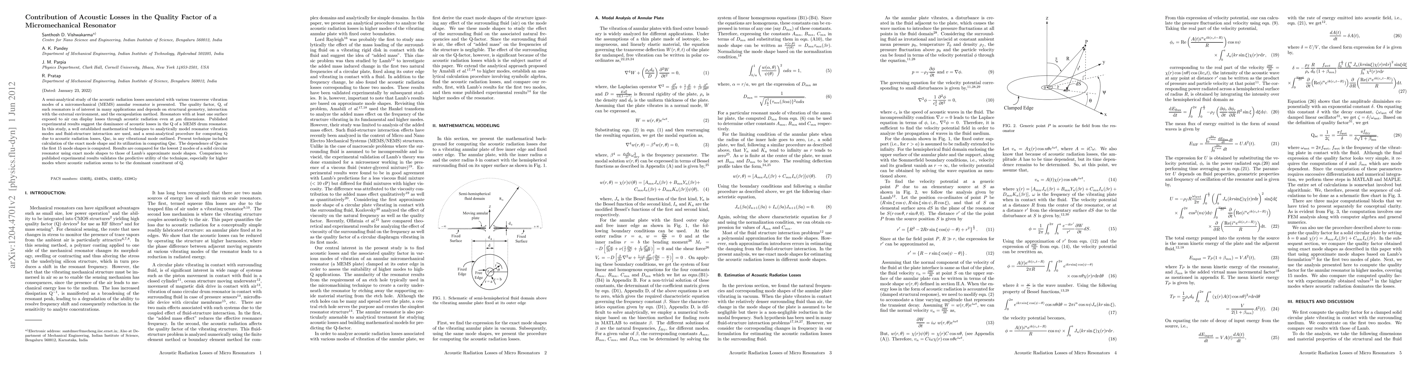 A semi-analytical study of the acoustic radiation losses associated with various transverse vibration modes of a micromechanical (MEMS) annular resonator is presented. The quality factor, Q, of such resonators is of interest in many applications and depends on structural geometry, interaction with the external environment, and the encapsulation method. Resonators with at least one surface exposed to air can display losses through acoustic radiation even at micro meter dimensions. Published experimental results suggest the dominance of acoustic losses in the Q of a MEMS drum resonator. In this study, a well established mathematical techniques to analytically model resonator vibration modes and fluid-structure interaction are used, and a semi-analytical procedure for computing Q due to acoustic radiation losses, Qac, in any vibrational mode outlined. Present technique includes calculation of the exact mode shape and its utilization in computing Qac. The dependence of Qac on the first 15 mode shapes is computed. Results are compared for the lowest 2 modes of a solid circular resonator using exact mode shapes to those of Lamb's approximate mode shapes. Comparison to published experimental results validates the predictive utility of the technique, especially for higher modes where acoustic radiation seems to be the dominant constituent of Q.