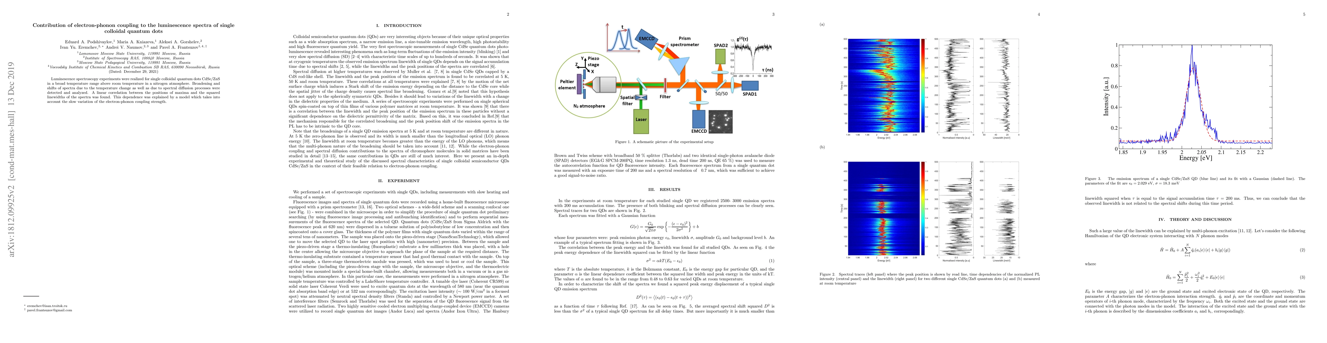 This study investigates the luminescence spectra of single CdSe/ZnS colloidal quantum dots, revealing broadening and shifts due to temperature changes and spectral diffusion. The observed linear correlation between spectral maxima and squared linewidths is attributed to varying electron-phonon coupling strength.