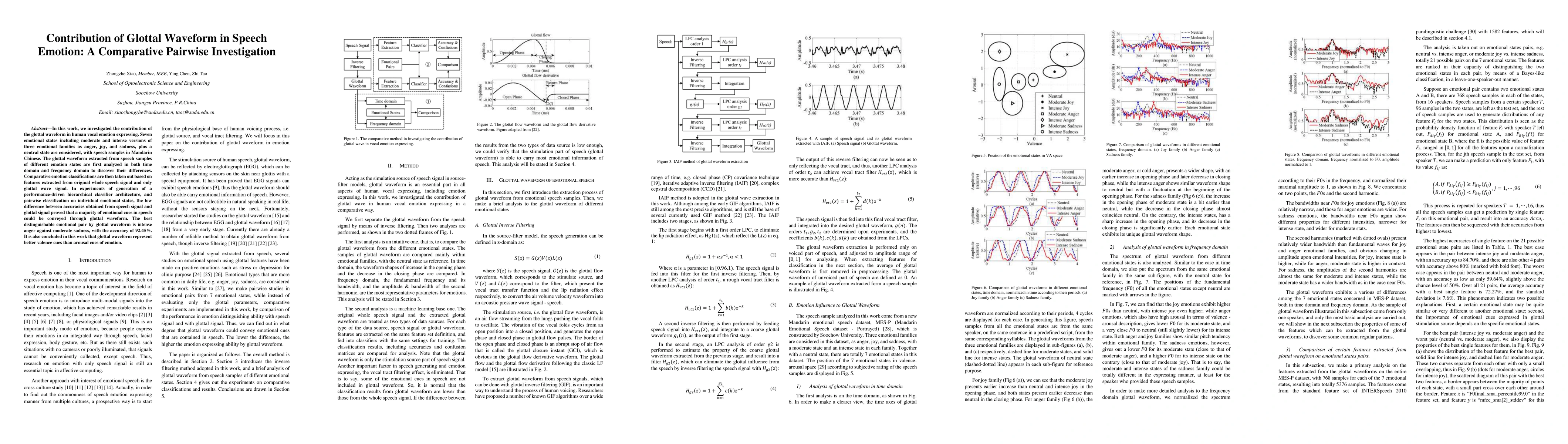 In this work, we investigated the contribution of the glottal waveform in human vocal emotion expressing. Seven emotional states including moderate and intense versions of three emotional families as anger, joy, and sadness, plus a neutral state are considered, with speech samples in Mandarin Chinese. The glottal waveform extracted from speech samples of different emotion states are first analyzed in both time domain and frequency domain to discover their differences. Comparative emotion classifications are then taken out based on features extracted from original whole speech signal and only glottal wave signal. In experiments of generation of a performance-driven hierarchical classifier architecture, and pairwise classification on individual emotional states, the low difference between accuracies obtained from speech signal and glottal signal proved that a majority of emotional cues in speech could be conveyed through glottal waveform. The best distinguishable emotional pair by glottal waveform is intense anger against moderate sadness, with the accuracy of 92.45%. It is also concluded in this work that glottal waveform represent better valence cues than arousal cues of emotion.