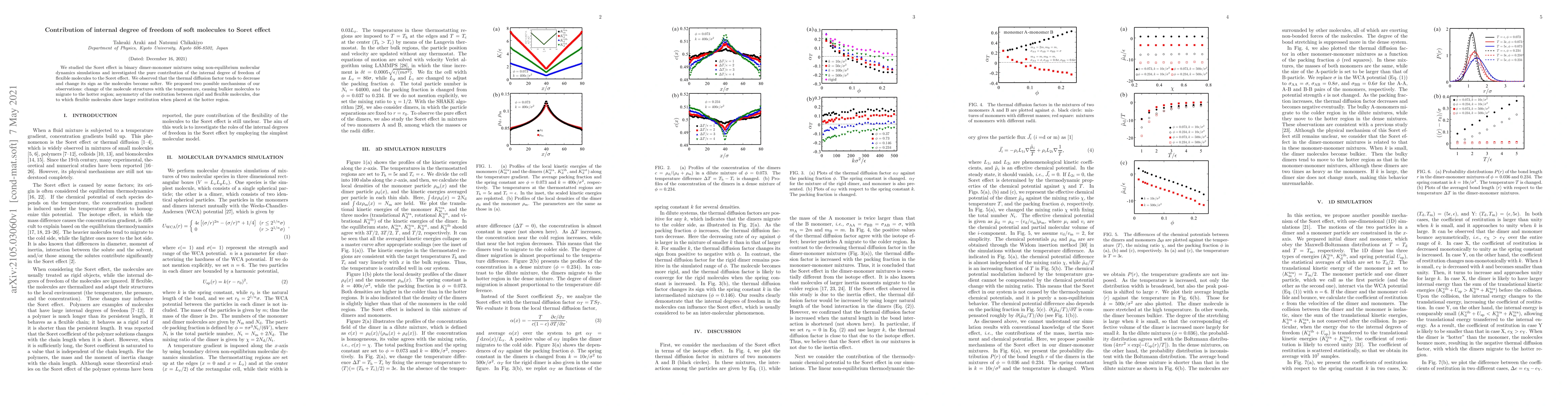 We studied the Soret effect in binary dimer-monomer mixtures using non-equilibrium molecular dynamics simulations and investigated the pure contribution of the internal degree of freedom of flexible molecules to the Soret effect. We observed that the thermal diffusion factor tends to decrease and change its sign as the molecules become softer. We proposed two possible mechanisms of our observations: change of the molecule structures with the temperature, causing bulkier molecules to migrate to the hotter region; asymmetry of the restitution between rigid and flexible molecules, due to which flexible molecules show larger restitution when placed at the hotter region.