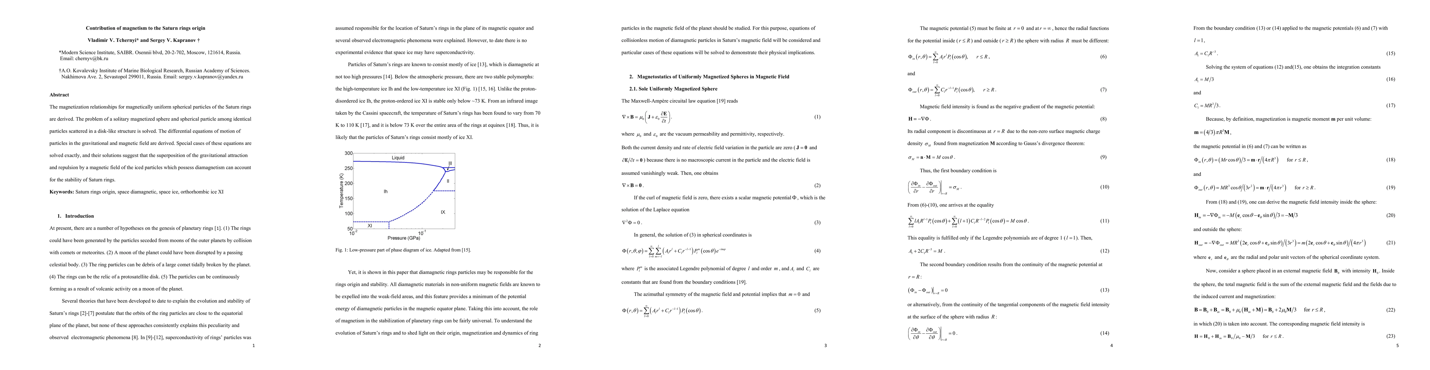 The magnetization relationships for magnetically uniform spherical particles of the Saturn rings are derived. The problem of a solitary magnetized sphere and spherical particle among identical particles scattered in a disk-like structure is solved. The differential equations of motion of particles in the gravitational and magnetic field are derived. Special cases of these equations are solved exactly, and their solutions suggest that the superposition of the gravitational attraction and repulsion by a magnetic field of the iced particles which possess diamagnetism can account for the stability of Saturn rings.