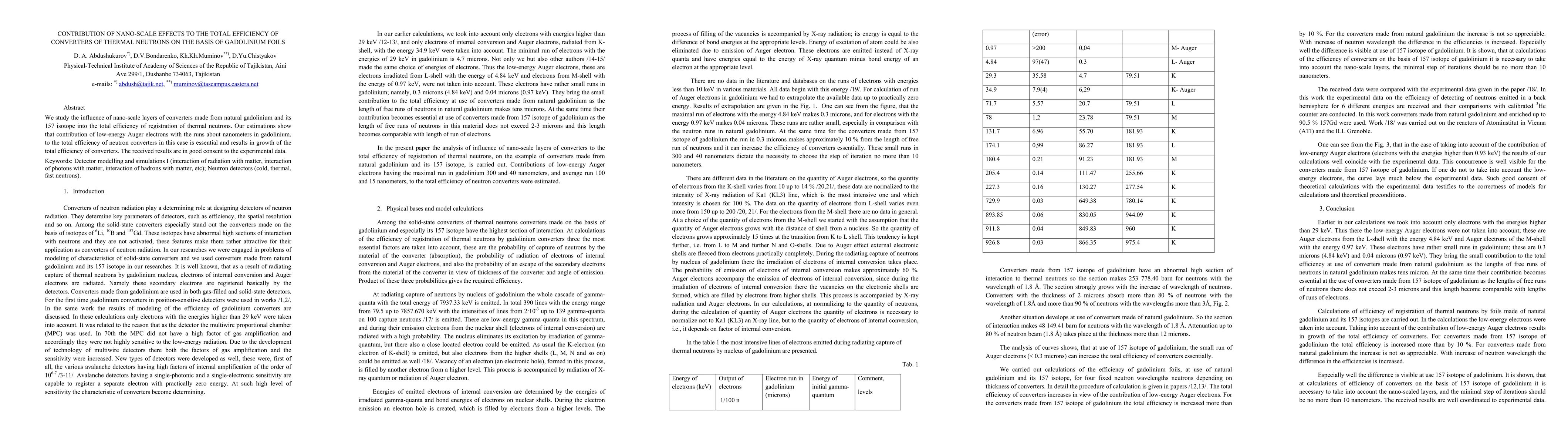 We study the influence of nano-scale layers of converters made from natural gadolinium and its 157 isotope into the total efficiency of registration of thermal neutrons. Our estimations show that contribution of low-energy Auger electrons with the runs about nanometers in gadolinium, to the total efficiency of neutron converters in this case is essential and results in growth of the total efficiency of converters. The received results are in good consent to the experimental data.