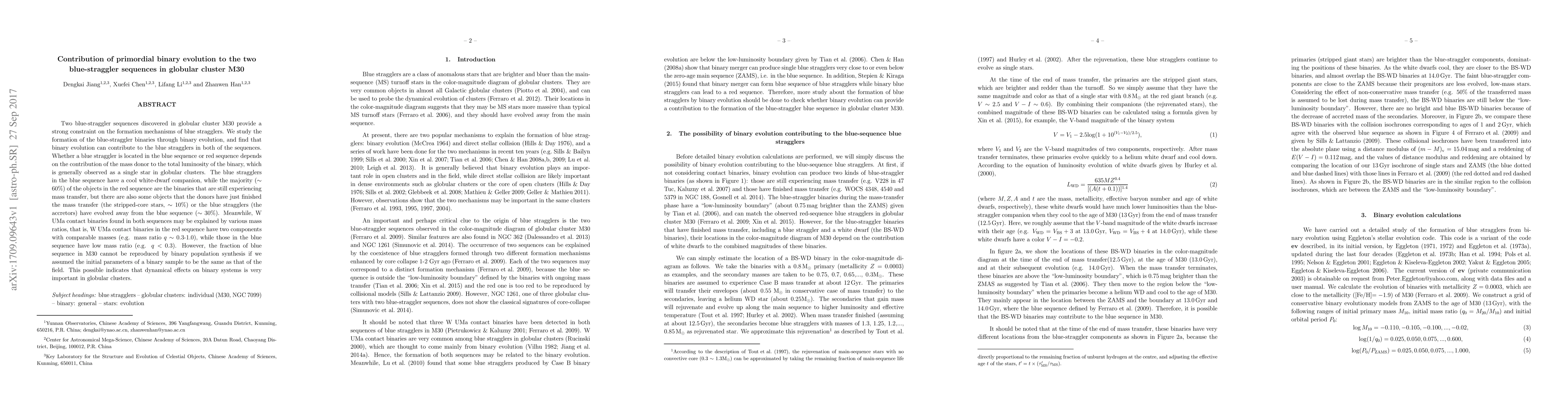 This paper investigates the formation of blue stragglers in globular cluster M30 via primordial binary evolution, finding that binary evolution contributes to both blue-straggler sequences. The sequences' distinction depends on mass donor contributions, with different evolutionary states observed in each.