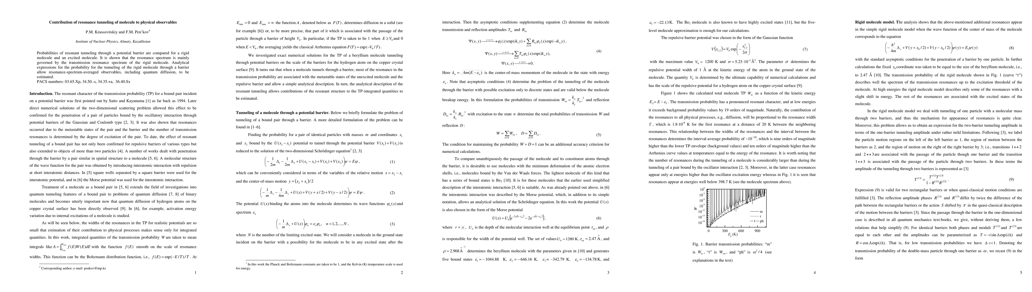 Probabilities of resonant tunneling through a potential barrier are compared for a rigid molecule and an excited molecule. It is shown that the resonance spectrum is mainly governed by the transmission resonance spectrum of the rigid molecule. Analytical expressions for the probability for the tunneling of the rigid molecule through a barrier allow resonance-spectrum-averaged observables, including quantum diffusion, to be estimated.