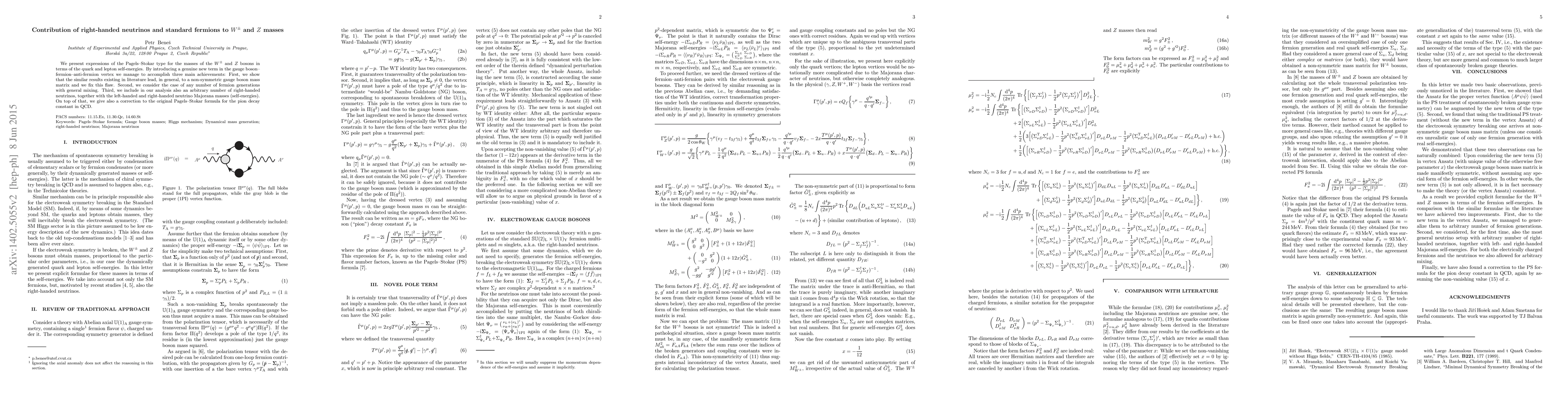 We present expressions of the Pagels--Stokar type for the masses of the W and Z bosons in terms of the quark and lepton self-energies. By introducing a genuine new term in the gauge boson--fermion--anti-fermion vertex we manage to accomplish three main achievements: First, we show that the similar results existing in literature lead, in general, to a non-symmetric gauge boson mass matrix and we fix this flaw. Second, we consider the case of any number of fermion generations with general mixing. Third, we include in our analysis also an arbitrary number of right-handed neutrinos, together with the left-handed and right-handed neutrino Majorana masses (self-energies). On top of that, we give also a correction to the original Pagels--Stokar formula for the pion decay constant in QCD.