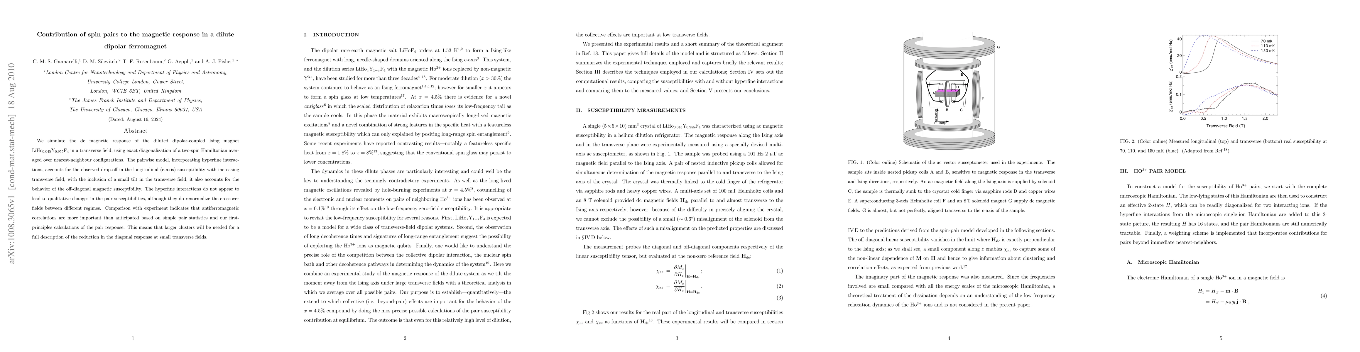 We simulate the dc magnetic response of the diluted dipolar-coupled Ising magnet LiHo\(_{0.045}\)Y\(_{0.955}\)F\(_4\) in a transverse field, using exact diagonalization of a two-spin Hamiltonian averaged over nearest-neighbour configurations. The pairwise model, incorporating hyperfine interactions, accounts for the observed drop-off in the longitudinal (c-axis) susceptibility with increasing transverse field; with the inclusion of a small tilt in the transverse field, it also accounts for the behavior of the off-diagonal magnetic susceptibility. The hyperfine interactions do not appear to lead to qualitative changes in the pair susecptibilities, although they do renormalize the crossover fields between different regimes. Comparison with experiment indicates that antiferromagnetic correlations are more important than anticipated based on simple pair statistics and our first-principles calculations of the pair response. This means that larger clusters will be needed for a full description of the reduction in the diagonal response at small transverse fields.