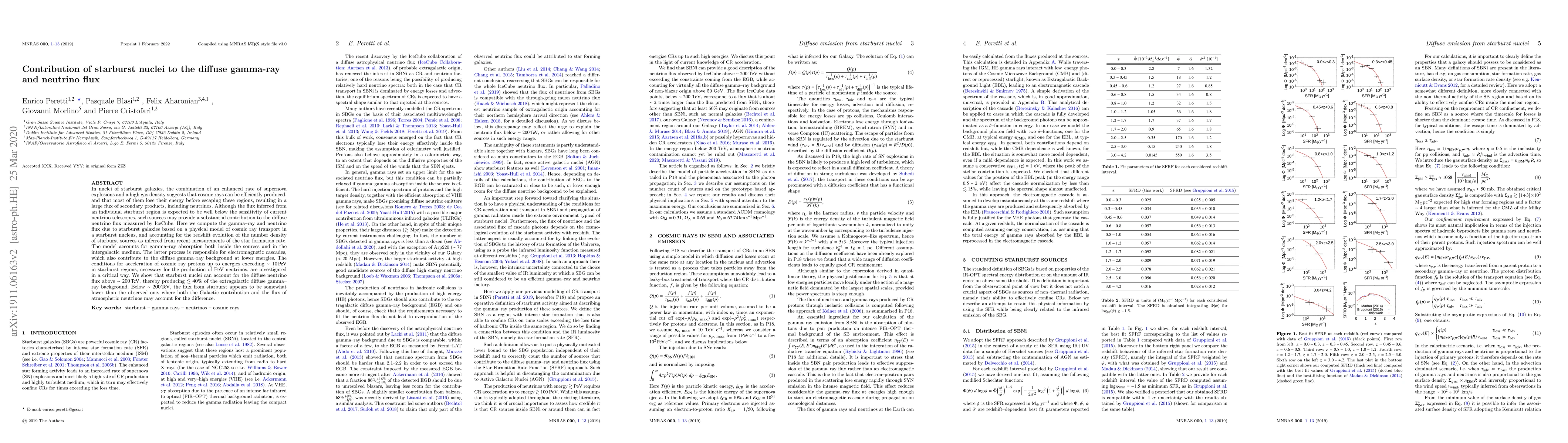 This paper investigates the contribution of starburst nuclei in galaxies to the diffuse gamma-ray and neutrino flux, finding that these regions can account for up to 40% of the extragalactic diffuse gamma-ray background and the majority of the diffuse neutrino flux above 200 TeV. The model accounts for cosmic ray transport and redshift evolution, suggesting that while starburst galaxies may not individually reach current neutrino telescope sensitivities, they collectively contribute significantly to the observed diffuse neutrino flux.